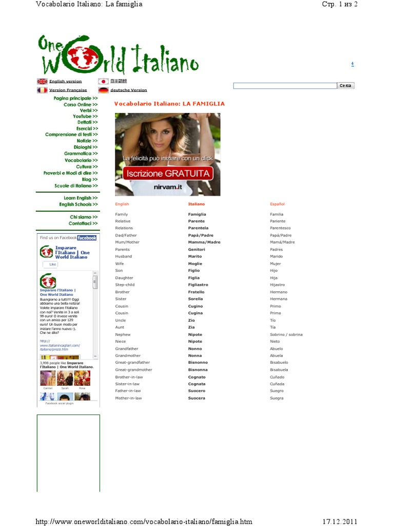 Vocabolario Italiano: La famiglia