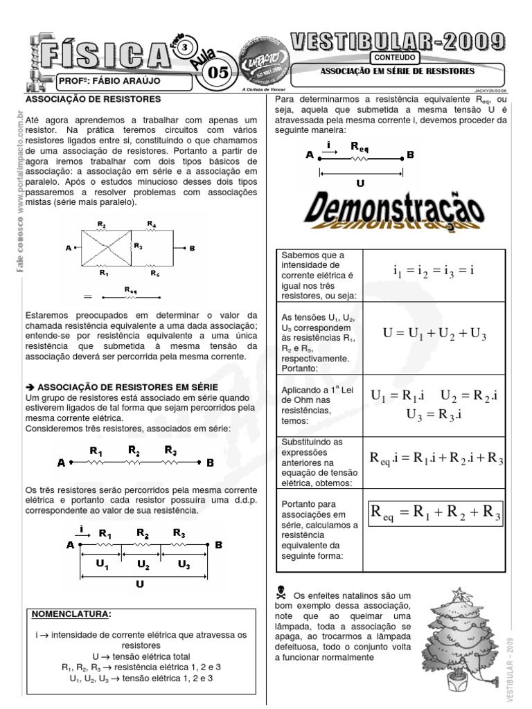 Um grupo de resistores está associado em série quando de Ohm nas U1 = R 1 .i U 2 = R 2 .i