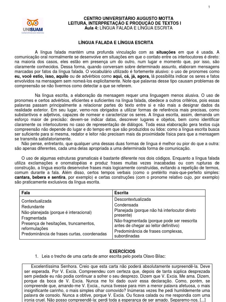 CENTRO UNIVERSITÁRIO AUGUSTO MOTTA LEITURA, INTERPRETAÇÃO E PRODUÇÃO DE TEXTOS I Aula 4: LÍNGUA FALADA E LÍNGUA ESCRITA