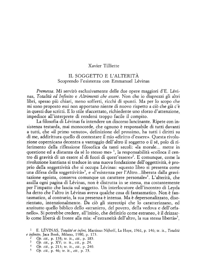 8 Cfr., E. LEVINAS, Autrement qu'étre, cit, p. 190; tr. it., cit, p. 187.Il soggetto e Valterita 13.