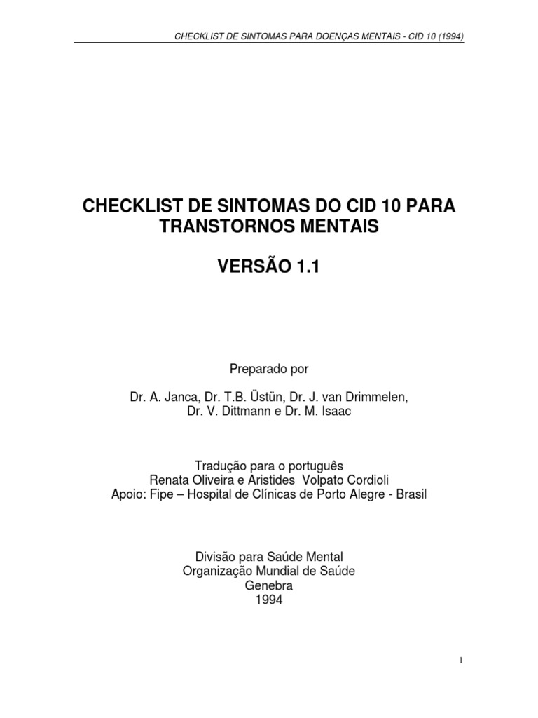 CHECKLIST DE SINTOMAS PARA DOENÇAS MENTAIS - CID 10 (1994)