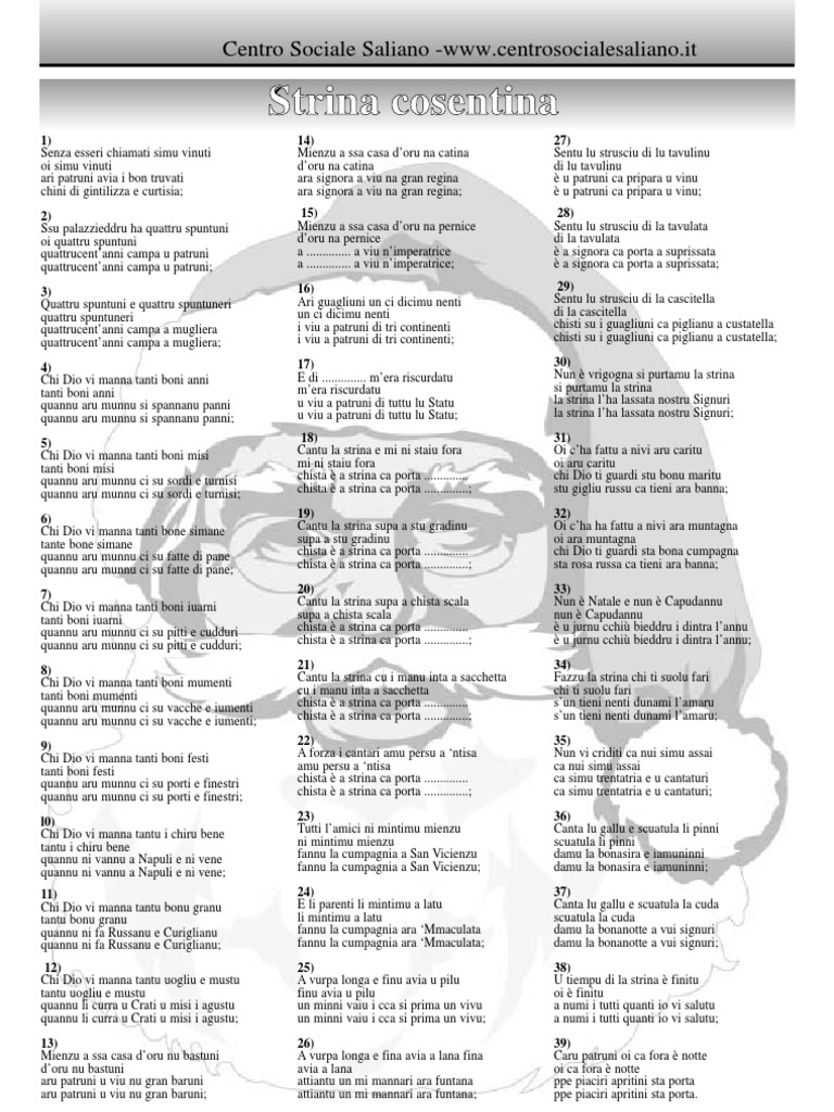 Chi Dio vi manna tanti boni mumenti Cantu la strina cu i manu inta a sacchetta Fazzu la strina chi ti suolu fari