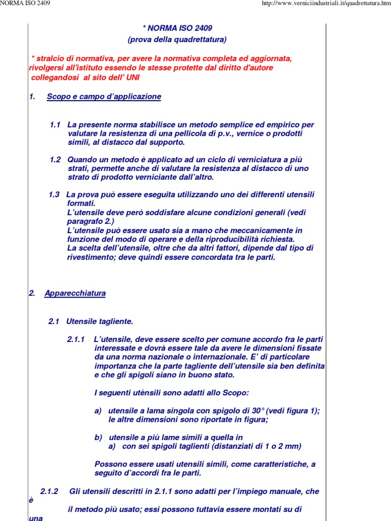 * NORMA ISO 2409 (prova della quadrettatura) * stralcio di normativa, per avere la normativa completa ed aggiornata, rivolgersi all'istituto essendo le stesse protette dal diritto d'autore collegandosi al sito dell' UNI 1. Scopo e campo dapplicazione