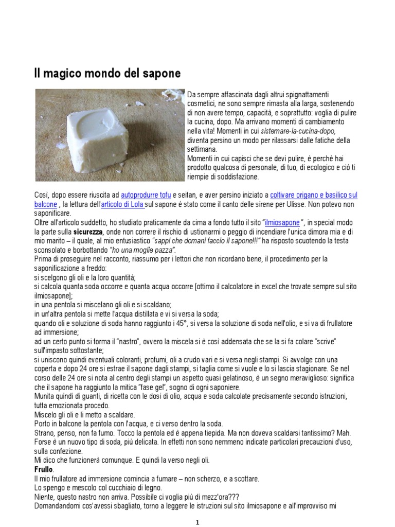 premio da sola con la palma d'oro per la pirleria applicata: ho usato la soda al posto della SODA CAUSTICA!!!!!!!!!! Avrei potuto frullare per due ere, senza ottenere il nastro. Il mio poltiglio oleoso, manco a dirlo, da buttare. Posso farmi scoraggiare da un'inezia del genere? Sia mai! Al ritorno dal lavoro mi fermo quindi in un negozio di ferramenta, domandando la soda CAUSTICA. [avete finito di ridere????? :P] Il commesso mi fa mille raccomandazioni e mi chiede cosa devo scrostare! Io: no, non scrosto niente, ci faccio il sapone!!! commesso: il sapone? Ma guarda... una cosa antica! io: hehe, s, diciamo cos commesso: ma sa che mia nonna faceva il sapone! In campagna! Mi ricordo che mescolava, mescolava, e poi versava tutto in questi grandi stampi! Che ricordi mi ha fatto venire in mente! e sorride tutto mentre me lo [Link] ricordarmi di portargli una saponetta fai-da-me, quando sar stagionata a sufficienza! :) S, perch questa volta il sapone riuscito! Decido di iniziare con la ricetta pi semplice del mondo, usando solo olio d'oliva. E quindi procedo con: 300 g olio d'oliva 38,19 g soda CAUSTICA 90 g acqua distillata Questa volta la miscela caustica altroch se scotta ;) Il nastro invece si forma dopo pochi minuti di frullatore! Tutta esaltata saltello il nastro! Il nastro! Mentre il marito mi guarda sempre pi rassegnato alla mia intrinseca follia. Per non parlare di quando, dopo mezz'ora dal versamento negli stampini e avvolgimento degli stessi in coperta calda, vado a sbirciare e vedo la mitica fase gel! Sono soddisfazioni, s. Che mi hanno ripagata dal sistemare-la-cucina-dopo, ovvero lavare e asciugare le pentole, il frullatore, il piano cottura (sebbene rivestito d'alluminio, qualche goccia arriva sempre). Ma sono talmente esaltata che faccio tutto in rapidit. Ho ottenuto delle saponette bianche, dal profumo di pulito, che ho messo a stagionare. La foto sopra la prova! Due giorni dopo, saponificavo di nuovo, questa volta con una miscela di vari oli e l'aggiunta di oli essenziali al nastro. Cosa posso dirvi di pi? Saponificare divertente, ecologico, rilassante, soddisfacente! Le ricette che si possono sperimentare sono tantissime, ognuno pu inventarsi la propria. Provate! Osate! Saponificate!