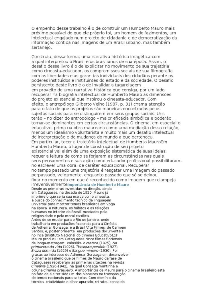 , um intelectual engajado num projeto de cidadania e de democratizao da informao contida nas imagens de um Brasil urbano, mas tambm sertanejo. Construiu, dessa forma, uma narrativa histrica imagtica com a qual interpretou o Brasil e os brasilianos de sua poca. Assim, o desafio desse livro o de explicitar no movimento de sua trajetria como cineasta-educador, os compromissos sociais de sua filmografia com as liberdades e as garantias individuais dos cidados perante os poderes institudos e instituintes do estado e da sociedade. O desafio persistente deste livro o de invalidar a tagarelagem em proveito de uma narrativa histrica que consiga, por um lado, recuperar na biografia intelectual de Humberto Mauro as dimenses do projeto existencial que inspirou o cineasta-educador. Com efeito, o antroplogo Gilberto Velho (1987, p. 31) chama ateno para o fato de que os projetos so maneiras encontradas pelos sujeitos sociais para se distinguirem em seus grupos sociais. Uns tero no dizer do antroplogo maior eficcia simblica e podero tornar-se dominantes em certas circunstncias. O cinema, em especial o educativo, prima na obra maureana como uma mediao dessa relao, menos um idealismo voluntarista e muito mais um desafio intelectual de interpretao e de mudana do mundo a que pertenceu. Em particular, tecer a trajetria intelectual de Humberto MauroEm Humberto Mauro, o lugar de construo de seu projeto existencial vai alm de uma exposio sistemtica de suas ideias, requer a leitura de como se forjaram as circunstncias nas quais seus pensamentos e sua ao como educador profissional possibilitaramno escrever uma obra, de carter educacional. Recuperar no tempo passado uma trajetria resgatar uma imagem do passado perpassado, velozmente, enquanto passado que s se deixou fixar no momento em que reconhecido como imagem que relampeja irreversivelmenteImportncia de Humberto Mauro