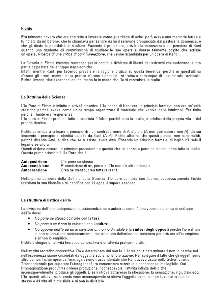ferrea e fu notato da un barone, che lo chiamava per sentire da lui il sermone pronunciato dal pastore la domenica, e che gli diede la possibilit di studiare. Facendo il precettore, arriv alla conoscenza del pensiero di Kant quando uno studente gli commission di studiare le sue opere e rimase talmente colpito che scrisse unopera, Ricerca di una critica di ogni Rivelazione, che venne scambiata per unopera di Kant. La filosofia di Fichte riscosse successo per la continua richiesta di libert dei tedeschi che vedevano la loro patria calpestata dalle truppe napoleoniche. Infatti, mentre Kant, pur facendo prevalere la ragione pratica su quella teoretica, perch in questultima c'erano gli errori, mentre nella pratica c'erano i postulati, si trattava comunque di una morale razionale. Fichte, invece, sbarazzandosi del noumeno fa in modo che l'Io si costruisca la realt.