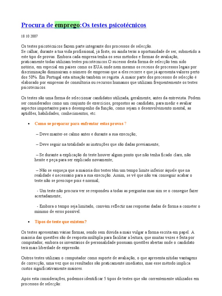 psicotcnicos. Para que servem os testes? Os testes psicotcnicos so, no fundo, exerccios que o futuro empregador prope ao candidato para poder medir e avaliar os diferentes aspectos que considera importantes para o desempenho da funo em causa. So testes normalmente escritos, cronometrados e s existe uma resposta correcta. Cada teste mede uma s caracterstica, no entanto, o facto de ter um tempo limite, permite perceber como que o candidato reage em situaes de presso, qual a sua rapidez de raciocnio, o tipo de gesto do tempo, etc.olocao. Como se preparar para enfrentar estas provas Deve manter-se calmo antes e durante a sua execuo; Deve seguir na totalidade as instrues que so dadas previamente; Se durante a explicao do teste houver algum ponto que no tenha ficado claro, no hesite e pea para ser explicado novamente; No se esquea que a maioria dos testes tm um tempo limite inferior quele que na realidade necessrio para a sua execuo. Assim, se v que no vai conseguir acabar o teste no se preocupe pois normal; Um teste no procura ver se respondeu a todas as perguntas mas sim se o consegue fazer acertadamente; Embora o tempo seja limitado, convm reflectir nas respostas dadas de forma a cometer o mnimo de erros possvel. Que vantagens podem ter os testes? Serem padronizados e iguais para todos; Igualdade de tratamento; Determinam as capacidades e alguns pontos fracos de cada um; Podem prever uma possvel evoluo de carreira. E desvantagens? A ansiedade e a tenso que normalmente provocam no candidato; O facto de ser eliminatrios; Serem rgidos. Como enfrentar a reprovao com base nos testes? importante perceber que o resultado dos testes pode variar muito em funo de inmeros