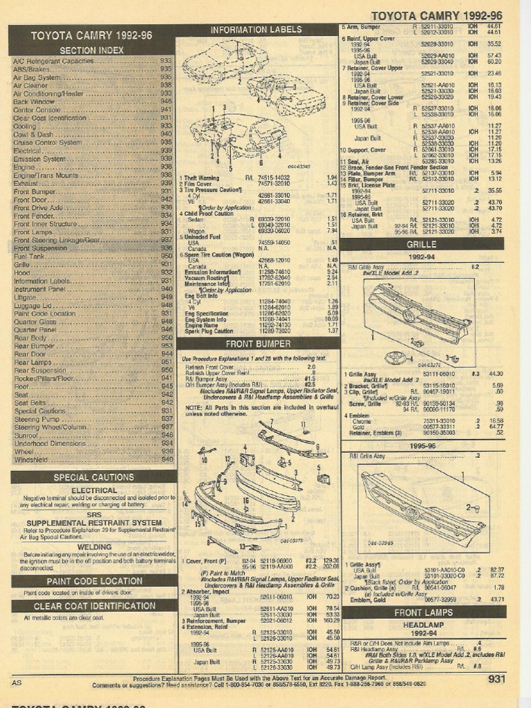 36.43, . #[Link] & ,Fend,sr Rem9~ c 36.43, '3 Support, HiJOd' R 53440-390,55 38.0'5·' L 53450·A9010 38,05 flwlHood Removed Deduct .1 3.8,05 Hati;h May 92:94 53510:~0020 38.05 95096 5351 O·AGO 10 Spring, Latch Upper1J OOQ84·50002 2 lens'il Spring. Latch Lowel1l 90084050003 1992-94 USA Buill R 81511-06010 #,3' 30.48 ~Included wtlatthAssy .. t 81521·0601Q #1.3, 30.48 5 Cabte, Release' 53630·33010 Ja,pan Built. R 815~ 1:33011 11,;1 27.41 6 Handle, Release (a) [Link] L 81521·,33011 H.3' 27.4'1 (a) Blue listed OalerbyApplir:alion 199&.96 _B 8151 (·060,30 N.3 30.~ 7 Hook Assy, Safely' , S35Stul30'l1 L 81521·06030 11.3 30048, Catch Safety :Hook 53557.33010 1 Lainp·Asay 1I1nclilded in R&R FlOn! Cover &lor O!H fran! BumRfN Spring. Catch~ 90508-18096 USA BuiH R a l11Q.()6032 11.6, 120.01 L 61150.06Q32 11.6" 161.54 Assy, In~llldeS R&R Side Marker LaM!P . 'IIlncludedwlSalely Hook Ass), Japan Built R 8111043162" U 229.47 3 Socket1J· 8 insulBkI!' Hood USA BiJJH RA_ 6151.&.060)0 14,08 XLE Mo1de.1 ' _ 53ll41,33010, L a 1150-.33162 .. 11.6229.47 ,9ZAIL 9p07&.99j)786.49 DX, bE, SE Model ~~34f.a302ff flR&R Both SidB$ 1.Q, Includes ..R&VR&R Grille & , [Link] •• < !1~:96RIL af5is.~OI0 14,08 Clip,. Insulator j12) 90467.(}9{J06 ParlclampAssy 2Lens~ ", . _ 4,Bulll1l RIl 00234·01156 #.;1 .83 9 SInker Hoed 5333J.'33010 'USA Built R 8113Q.06Q30 #.2 189.54 ~/nclud8o' [Link]' 10 ASsy Hood Front 533BF33010 L 8117()'00030 #.2- 189.54 . 'il1tJe/u'ded in R&RSlgnalLan,vt . . Clip, 110nl Seai~@) 9114a7H)8011~83 Japan'Built R 8l130-33l62 1.2 l82,84 Screw, tamp RIl,. 001§ll-50150 .72 '11lncJudlld w/Hoiir/,Fronl Seal Assy b 8117()'33162' #.2 182.84 11 Seal Assy, HotMI Rear ~. 53383·33Q10 #W/LampAssf RemoVed ,. " Clip, ,Rear Seal (a) 3 HoUGing, Heedlamp'l. . Genter (9) 90467·06138' IJSA Built . . Ft 81105-06030 IOH Outer R 90467-09151 ., L 8l tOfHl!303O 101'1 L 90467·091 S2 Japan Built R81l05-33162 101'1 (a) Included wMood ReM $ealAssy L 81106'33162 IOH 12 Seal, Hood 4 Butb~ Illustration Located in Next Column To Headlamp R 53183·33010 0111ef Et/L 90000·811)40 11.2 18:63 L 53184·33010 Inner AIL 90080·81041 11.2, 18.63 Clip, Hood Seal (41Slde) AIL 904137'08011'83 ... ·fI/nciuded In R&R Lens &/Of LaI1lfl Assy 1 LempASsY 5 Sprlhg"Ten$ionll' USA Burl!' ',AIL Bl1:2h06010 101'1 2.03 To 2-93' Japan Boilt Ril90075·25SjS IOH 2.31