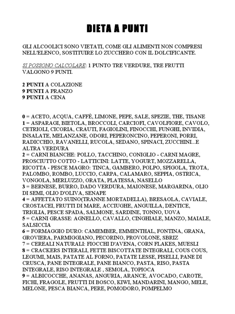 GLI ALCOOLICI SONO VIETATI, COME GLI ALIMENTI NON COMPRESI NELL'ELENCO, SOSTITUIRE LO ZUCCHERO CON IL DOLCIFICANTE. SI POSSONO CALCOLARE: 1 PUNTO TRE VERDURE, TRE FRUTTI VALGONO 9 PUNTI. 2 PUNTI A COLAZIONE 9 PUNTI A PRANZO 9 PUNTI A CENA 0 = ACETO, ACQUA, CAFF, LIMONE, PEPE, SALE, SPEZIE, THE, TISANE 1 = ASPARAGI, BIETOLA, BROCCOLI, CARCIOFI, CAVOLFIORE, CAVOLO, CETRIOLI, CICORIA, CRAUTI, FAGIOLINI, FINOCCHI, FUNGHI, INVIDIA, INSALATE, MELANZANE, ODORI, PEPERONCINO, PEPERONI, PORRI, RADICCHIO, RAVANELLI, RUCOLA, SEDANO, SPINACI, ZUCCHINI...E ALTRA VERDURA 2 = CARNI BIANCHE: POLLO, TACCHINO, CONIGLIO - CARNI MAGRE, PROSCIUTTO COTTO - LATTICINI: LATTE, YOGURT, MOZZARELLA, RICOTTA - PESCE MAGRO: TINCA, GAMBERO, POLPO, SPIGOLA, TROTA, PALOMBO, ROMBO, LUCCIO, CARPA, CALAMARO, SEPPIA, OSTRICA, VONGOLA, MERLUZZO, ORATA, PLATESSA, NASELLO 3 = BERNESE, BURRO, DADO VERDURA, MAIONESE, MARGARINA, OLIO DI SEMI, OLIO D'OLIVA, SENAPE 4 = AFFETTATO SUINO(TRANNE MORTADELLA), BRESAOLA, CAVIALE, CROSTACEI, FRUTTI DI MARE, ACCIUGHE, ANGUILLA, DENTICE, TRIGLIA, PESCE SPADA, SALMONE, SARDINE, TONNO, UOVA 5 = CARNI GRASSE: AGNELLO, CAVALLO, CINGHIALE, MANZO, MAIALE, SALSICCIA 6 = FORMAGGIO DURO: CAMEMBER, EMMENTHAL, FONTINA, GRANA, GROVIERA, PARMIGGIANO, PECORINO, PROVOLONE, SBRIZ 7 = CEREALI NATURALI: FIOCCHI D'AVENA, CORN FLAKES, MUESLI 8 = CRACKERS INTERALI, FETTE BISCOTTATE INTEGRALI, COUS COUS, LEGUMI, MAIS, PATATE AL FORNO, PATATE LESSE, PISELLI, PANE DI CRUSCA, PANE INTEGRALE, PANE BIANCO, PASTA, RISO, PASTA INTEGRALE, RISO INTEGRALE , SEMOLA, TOPIOCA 9 = ALBICOCCHE, ANANAS, ANGURIA, ARANCE, AVOCADO, CAROTE, FICHI, FRAGOLE, FRUTTI DI BOSCO, KIWI, MANDARINI, MANGO, MELE, MELONE, PESCA BIANCA, PERE, POMODORO, POMPELMO