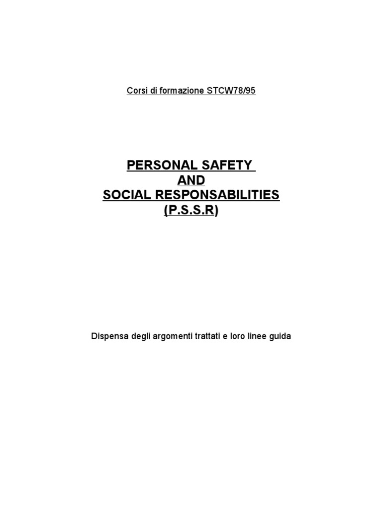 PREFAZIONE Un corso che porti un acronimo come titolo ha bisogno di qualche spiegazione. Il nostro porta quattro lettere PSSR che significa PERSONAL SAFETY and SOCIAL RESPONSABILITY. Se le due prime parole sono chiare e credo comprensibili a tutti, le due ultime forse hanno bisogno di qualche parola in pi, del perch di un corso che le preveda, di cosa si intenda con esse e di come si inseriscano nella vita di una nave. La Social Responsability, SR, per essere meglio compresa dovrebbe essere chiamata con il nome completo di responsabilit sociale d'impresa (o Corporate Social Responsibility, CSR). Con questo termine si intende l'integrazione di preoccupazioni di natura etica all'interno della visione strategica d'impresa: una manifestazione della volont delle grandi, piccole e medie imprese di gestire efficacemente le problematiche d'impatto sociale ed etico al loro interno e nelle zone di attivit. Si tratta di un concetto innovativo e molto discusso, espresso per la prima volta nel 1984 da R. Edward Freeman nel suo saggio "Strategic Management: a Stakeholder Approach", Pitman, London 1984. Ma gi nel 1969, in "Strutture integrate nel sistema distributivo italiano", si afferma che l' attivit d' impresa, pur mirando al profitto, deve tenere esplicitamente presenti una serie di istanze interne ed esterne all' impresa, anche di natura socio-economica, per la misurazione delle quali viene proposto il "metodo della scomposizione dei parametri". Un'impresa che adotti un comportamento socialmente responsabile, monitorando e rispondendo alle aspettative economiche, ambientali, sociali di tutti i portatori di interesse (stakeholders) coglie anche l'obiettivo di conseguire un vantaggio competitivo e a massimizzare gli utili di lungo periodo. Un prodotto, infatti, non apprezzato unicamente per le caratteristiche qualitative esteriori; il suo valore stimato in gran parte per le caratteristiche non materiali, quali le condizioni di fornitura, i servizi di assistenza e di personalizzazione, limmagine ed infine la storia del prodotto stesso. La consapevolezza, dei produttori e dei consumatori, circa la centralit di tali aspetti nelle dinamiche competitive e la tracciabilit storica della catena dei processi che hanno portato alla realizzazione del prodotto stanno attualmente guadagnando lattenzione dei vari attori presenti sul mercato. Risulta pertanto evidente come limpegno etico di unimpresa sia entrato direttamente nella cosiddetta catena del valore prospettando cos lutilizzo di nuovi percorsi e leve competitive coerenti con uno sviluppo sostenibile per la collettivit. Allinterno del mercato globale e locale, le imprese non hanno, infatti, unesistenza a s stante, ma sono enti che vivono e agiscono in un tessuto sociale che comprende vari soggetti, tra cui spicca sicuramente una societ civile molto attenta alloperato imprenditoriale. E, quindi, di fondamentale importanza lattivit dedicata al mantenimento delle relazioni con lesterno, verso i cosiddetti stakeholders (soggetti interessati, per es. Organizzazioni non governative, sindacati, mass-media ecc.). Nei sistemi di gestione aziendale, lattenzione agli stakeholders divenuta di importanza cruciale per le imprese e spesso lo sviluppo nel tempo di relazioni positive con tali soggetti pu diventare un elemento di valore aggiunto per limpresa. Ma il comportamento pi o meno etico di unimpresa interessa potenzialmente tutti i cittadini, ai quali non bastano astratte dichiarazioni di principi e valori: essi esigono ormai un impegno quotidiano e credibile, frutto di una precisa politica manageriale e di un sistema aziendale organizzato a tal fine. In relazione al concetto di responsabilit sociale si sono sviluppati modelli di gestione aziendale innovativi, legati al tema delletica. La Social Accountability International (SAI), organizzazione internazionale nata nel 1997, ha emanato la norma SA 8000 per assicurare nelle aziende eque condizioni di lavoro, un approvvigionamento etico di risorse ed un processo indipendente di controllo per la tutela dei lavoratori: lo standard SA 8000 (Social Accountability ovvero Responsabilit Sociale) il primo standard diffuso a livello internazionale circa la responsabilit sociale di unazienda ed applicabile ad aziende di qualsiasi settore merceologico, per valutare lottemperanza delle stesse ai requisiti