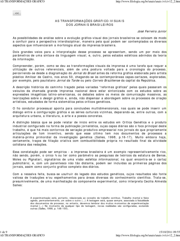 AS TRANSFORMAES GRFICO-VISUAIS DOS JORNAIS BRASILEIROS Jos Ferreira Junior As possibilidades de anlise sobre a evoluo grfico-visual dos jornais brasileiros se colocam de modo a confluir para a perspectiva interdisciplinar, maneira pela qual podem ser contemplados os diversos aspectos que influenciaram a morfologia atual da imprensa brasileira. Dois grandes veios para a interpretao desse processo se apresentam, sendo um por meio dos parmetros de uma sintaxe da linguagem visual; e, outro, pelos estados estticos advindos da teoria da informao. Compreender, porm, como se deu as transformaes visuais da imprensa uma tarefa que requer a utilizao de outros referenciais, alm de uma postura voltada para a cronologia do processo, percorrendo-se desde a diagramao do Jornal do Brasil antes da reforma grfica elaborada pelo artista plstico Amlcar de Castro, nos anos 50, chegando-se s contemporneas capas-cartazes, exploradas, por exemplo, pelo paulistano Jornal da Tarde ou pelo Correio Braziliense da capital da Repblica. A descrio histrica do caminho traado pelas variadas reformas grficas pelas quais passaram os veculos da chamada grande imprensa nacional deve estar sintonizada com os estudos sobre as expresses imagticas latino-americanas, os debates sobre os meios de comunicao massivos, as teorizaes sobre o design grfico e, ainda, no dispensar a abordagem sobre os processos de criao artsticos, estudados de forma sistemtica pelos crticos genticos. O fio condutor processual aponta para concluses multidimensionais, nas quais se pode inserir um dilogo entre a configurao grfica e as sries culturais vizinhas, deparando-se, entre outras, com a arquitetura urbana, a literatura, a arte e a poesia concretas. A distino bsica que se pode relatar de incio entre os estudos em Crtica Gentica e o produto industrial configurado na forma de publicao jornalstica, cujas capas dirias so o foco principal deste trabalho, que h mais contornos de seriao produtivo-empresarial nos jornais do que propriamente articulaes de tom inventivo, sendo que esse ltimo tem nos documentos de processos a matria-prima primordial da investigao gentica (Salles, 1998, p.16-17). Muito embora haja, certamente, traos de filiao criativa com combustibilidade prpria no resultado final da atividade cotidiana das redaes. Essa constatao pode ser emprica - a imprensa brasileira um exemplo representativamente rico, no sendo, porm, o nico ou ter como parmetro as pesquisas de tericos da estatura de Bense, Moles ou Pignatari, signatrios de uma viso esttica informacional, na qual encontra-se o cartaz publicitrio; e, com um parentesco no to distante, podem ser includas as primeiras pginas dos jornais, assim como conjunto grfico completo dos dirios. Com a ressalva feita, busca-se usufruir do legado dos estudos genticos, cujos resultados so fonte valiosa de tradues e/ou espelhamentos para reas diversas do conhecimento cientfico. Trata-se, presumivelmente, de uma manifestao do componente experimental, como interpreta Ceclia Almeida Salles: