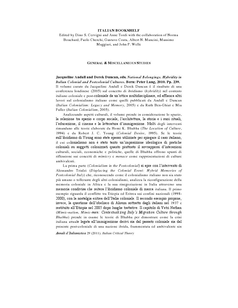 Jacqueline Andall and Derek Duncan, eds. National Belongings. Hybridity in Italian Colonial and Postcolonial Cultures. Bern: Peter Lang, 2010. Pp. 239. Il volume curato da Jacqueline Andall e Derek Duncan il risultato di una conferenza londinese (2005) sul concetto di ibridismo (hybridity) nel contesto italiano coloniale e post-coloniale da unottica multidisciplinare, ed affianca altri lavori sul colonialismo italiano come quelli pubblicati da Andall e Duncan (Italian Colonialism: Legacy and Memory, 2005) e da Ruth Ben-Ghiat e Mia Fuller (Italian Colonialism, 2005). Analizzando aspetti culturali, il volume prende in considerazione lo spazio, la relazione tra spazio e corpo sociale, larchitettura, la storia e i suoi rituali, leducazione, il cinema e la letteratura dimmigrazione. Molti degli interventi rimandano alle teorie elaborate da Homi K. Bhabha (The Location of Culture, 1994) e da Robert J. C. Young (Colonial Desire, 1995). Se le teorie sullibridismo di Young sono state spesso utilizzate per spiegare il caso italiano, il cui colonialismo non stato tanto unimposizione ideologica di pratiche coloniali su soggetti colonizzati quanto piuttosto il sovrapporsi dinterazioni culturali, sociali, economiche e politiche, quelle di Bhabha offrono spunti di riflessione sui concetti di mimicry e menace come rappresentazioni di culture ambivalenti. La prima parte (Colonialism in the Postcolonial) si apre con lintervento di Alessandro Triulzi (Displacing the Colonial Event: Hybrid Memories of Postcolonial Italy) che, riconoscendo come il colonialismo italiano non sia stato pi umano o tollerante degli altri colonialismi, analizza la riconfigurazione della memoria coloniale in Africa e la sua rinegoziazione in Italia attraverso una memoria condivisa che reitera libridismo coloniale di marca italiana. Il primo esempio riguarda il conflitto tra Etiopia ed Eritrea sui confini nazionali (19982000), con la nostalgia eritrea dellItalia coloniale. Il secondo esempio propone, invece, la questione dellobelisco di Aksum sottratto dagli italiani nel 1937 e restituito allEtiopia nel 2005 dopo lunghe trattative. Il capitolo di Vetri Nathan (Mimic-nation, Mimic-men: Contextualizing Italys Migration Culture through Bhabha) prende in esame le teorie di Bhabha per dimostrare come la crisi italiana attuale legata allimmigrazione derivi sia dal passato coloniale sia dal presente post-coloniale di una nazione ibrida, frammentata ed ambivalente sin
