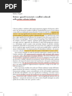 Italian Bookshelf 587 movimento letterario che si lega alla rivista La Ronda, definendolo, allo stesso tempo reazionario e moderno, evasivo e impegnato, marginale e rappresentativo, nazionalista ed europeo (75), per arrivare ad una nuova concezione di retroguardia, altra immagine con la quale il movimento era stato spesso identificato, che permette di integrare allo stesso tempo tutte quelle apparenti incompatibilit: una retroguardia che, secondo Carmine di Biase, mentre ripara le spalle, quella che rende possibili le vere avanzate (84). Nel saggio successivo ci si sposta al genere prediletto del fenomeno rondista, la prosa darte appunto, e alla sua essenziale pluralit daccezione, testimoniata dalla difficolt finanche nel trovarle un nome che possa accontentare tutti. Per Roberto Ridolfi, sentendo parlare di fantasie, capricci o saggi, chiunque cerchi di definire tali prose con un titolo meno generico e formale che quello di prose darte fa leffetto di un cane che si rincorra la coda (85); per Ferruccio Ulivi, pochi anni dopo, quella forma letteraria che fu variamente e alternativamente prosa darte, prosa poetica, prosa lirica, poemetto in prosa e, pi recentemente, frammento, elzeviro, capitolo (85), e ancora nel 2003 Carla Gubert la vede come un oggetto oscuro della letteratura del dopoguerra, arte della bella pagina con troppi nomi [] e dunque senza nome, inclassificabile (85). Da qui facile immaginare la ridda di voci e personaggi che segue, ognuna con una propria definizione o, meglio, visione di prosa darte, ognuna l a testimoniare la variet con cui questo genere si presenta e a rimarcare la necessit di continuare a indagarne modi e tempi. Il volume si chiude con Calvino e con il paradosso espresso da Asor Rosa secondo cui il pi grande narratore italiano della seconda met del Novecento non ha scritto romanzi (105). Pennings qui si muove di nuovo sul suo terreno favorito, quello di genere e modo appunto, per verificare le numerose affermazioni calviniane avverse s al genere romanzo, ma curiose e anzi appassionate, per il modo romanzesco, cercando di trovare cos una risposta alternativa al paradosso asoriano. Sarebbe proprio il modo, trasferibile senza sforzo tra un genere e laltro, la risposta calviniana al disagio verso il monolitico romanzo. E poich il romanzesco nasce in Italia ben prima del romanzo, Pennings arriva allintrigante affermazione che il paradosso da cui si era partiti dovrebbe essere applicato a tutta la storia del romanzo italiano in quanto il romanzesco avrebbe nella storia letteraria italiana, una sua vita autonoma e indipendente rispetto al genere romanzo inteso in senso stretto (120). Beppe Cavatorta, University of Arizona