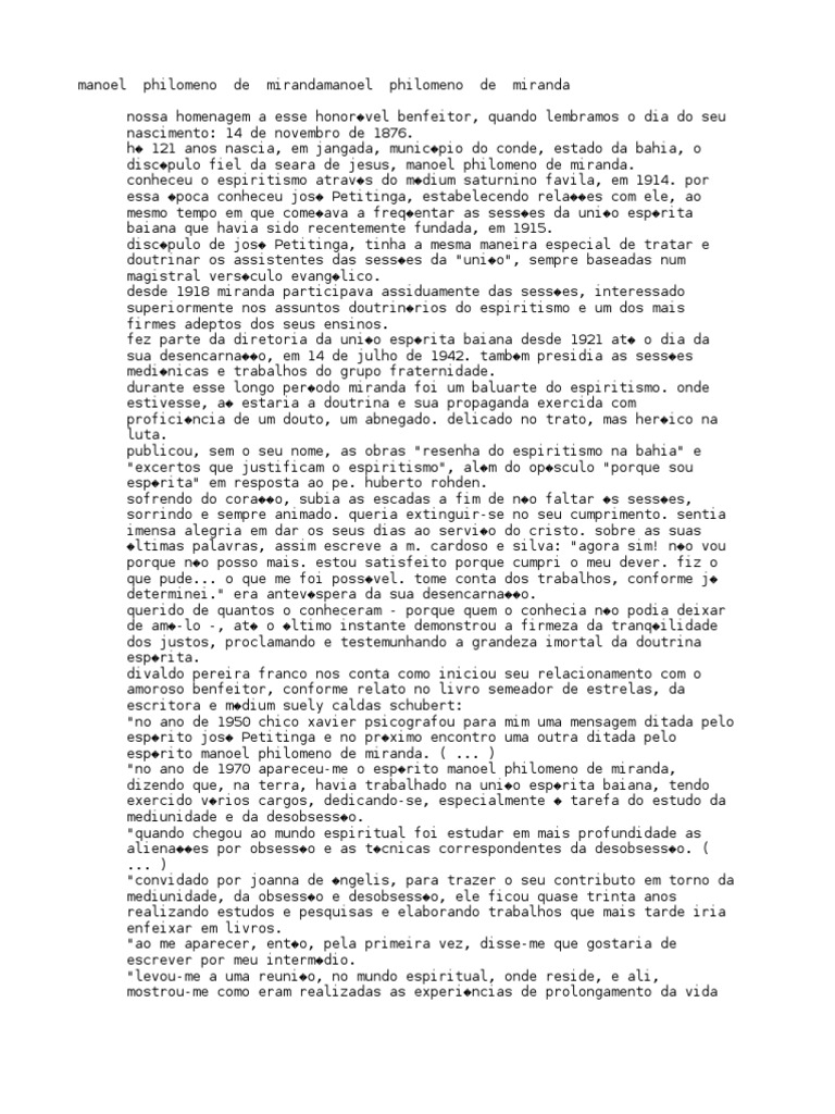 nascimento: 14 de novembro de 1876. h� 121 anos nascia, em jangada, munic�pio do conde, estado da bahia, o disc�pulo fiel da seara de jesus, manoel philomeno de miranda. conheceu o espiritismo atrav�s do m�dium saturnino favila, em 1914. por essa �poca conheceu jos� Petitinga, estabelecendo rela��es com ele, ao mesmo tempo em que come�ava a freq�entar as sess�es da uni�o esp�rita baiana que havia sido recentemente fundada, em 1915. disc�pulo de jos� Petitinga, tinha a mesma maneira especial de tratar e doutrinar os assistentes das sess�es da "uni�o", sempre baseadas num magistral vers�culo evang�lico. desde 1918 miranda participava assiduamente das sess�es, interessado superiormente nos assuntos doutrin�rios do espiritismo e um dos mais firmes adeptos dos seus ensinos. fez parte da diretoria da uni�o esp�rita baiana desde 1921 at� o dia da sua desencarna��o, em 14 de julho de 1942. tamb�m presidia as sess�es medi�nicas e trabalhos do grupo fraternidade. durante esse longo per�odo miranda foi um baluarte do espiritismo. onde estivesse, a� estaria a doutrina e sua propaganda exercida com profici�ncia de um douto, um abnegado. delicado no trato, mas her�ico na luta. publicou, sem o seu nome, as obras "resenha do espiritismo na bahia" e "excertos que justificam o espiritismo", al�m do op�sculo "porque sou esp�rita" em resposta ao pe. huberto rohden. sofrendo do cora��o, subia as escadas a fim de n�o faltar �s sess�es, sorrindo e sempre animado. queria extinguir-se no seu cumprimento. sentia imensa alegria em dar os seus dias ao servi�o do cristo. sobre as suas �ltimas palavras, assim escreve a m. cardoso e silva: "agora sim! n�o vou porque n�o posso mais. estou satisfeito porque cumpri o meu dever. fiz o que pude... o que me foi poss�vel. tome conta dos trabalhos, conforme j� determinei." era antev�spera da sua desencarna��o. querido de quantos o conheceram - porque quem o conhecia n�o podia deixar de am�-lo -, at� o �ltimo instante demonstrou a firmeza da tranq�ilidade dos justos, proclamando e testemunhando a grandeza imortal da doutrina esp�rita. divaldo pereira franco nos conta como iniciou seu relacionamento com o amoroso benfeitor, conforme relato no livro semeador de estrelas, da escritora e m�dium suely caldas schubert: "no ano de 1950 chico xavier psicografou para mim uma mensagem ditada pelo esp�rito jos� Petitinga e no pr�ximo encontro uma outra ditada pelo esp�rito manoel philomeno de miranda. ( ... ) "no ano de 1970 apareceu-me o esp�rito manoel philomeno de miranda, dizendo que, na terra, havia trabalhado na uni�o esp�rita baiana, tendo exercido v�rios cargos, dedicando-se, especialmente � tarefa do estudo da mediunidade e da desobsess�o. "quando chegou ao mundo espiritual foi estudar em mais profundidade as aliena��es por obsess�o e as t�cnicas correspondentes da desobsess�o. ( ... ) "convidado por joanna de �ngelis, para trazer o seu contributo em torno da mediunidade, da obsess�o e desobsess�o, ele ficou quase trinta anos realizando estudos e pesquisas e elaborando trabalhos que mais tarde iria enfeixar em livros. "ao me aparecer, ent�o, pela primeira vez, disse-me que gostaria de escrever por meu interm�dio. "levou-me a uma reuni�o, no mundo espiritual, onde reside, e ali, mostrou-me como eram realizadas as experi�ncias de prolongamento da vida f�sica atrav�s da transfus�o de energia utilizando-se do perisp�rito. "depois de uma conviv�ncia de mais de um m�s, aparecendo-me diariamente, para facilitar o interc�mbio ps�quico entre ele e mim, come�ou a escrever "nos bastidores da obsess�o", que s�o relatos, em torno da vida espiritual, das t�cnicas obsessivas e de desobsess�o. ( ... ) "na visita que manoel philomeno me permitiu fazer � Col�nia em que ele se hospedava, levou-me a uma curiosa biblioteca. mostrou-me como s�o arquivados os trabalhos gr�ficos que se fazem na terra. disse-me que, quando um escritor ou um m�dium, seja quem for, escreve algo que beneficia a humanidade - no caso do escritor - � um profissional, mas, o que ele produz � edificante, nessa biblioteca fica inscrito, com um tipo de letra bem caracter�stico, traduzindo a nobreza do seu conte�do. � medida que a mente, aqui, no planeta, vai elaborando, simultaneamente vai plasmando l�, nesses fich�rios muito sens�veis, que captam a onda mental e tudo imprimem. "quando a pessoa escreve por ideal e n�o � remunerado, ao se abrirem esses livros, as letras adquirem relevo e s�o de uma forma muito agrad�vel � vista, tendo uma peculiar luminosidade. se a pessoa, por�m, o faz por ideal e estando num momento dif�cil, sofrido, mas ainda assim escreve com beleza, esquecendo-se de si mesma, para ajudar a sociedade, a criatura humana, ao abrir-se o livro, as letras adquirem uma vibra��o musical e se transformam em verdadeiros cantos, em que a pessoa ouve, v� e capta os registros ps�quicos de quando o autor estava elaborando a tese. "o oposto tamb�m � verdadeiro. ( ... ) "eis porque vale a pena, quando estamos desalentados e sofridos, n�o desanimarmos e continuarmos as nossas tarefas, o que lhes d� um valor muito maior. porque o trabalho diletante, o desportivo, o do prazer, j� tem, na pr�pria a��o, a sua gratifica��o, enquanto o de sacrif�cio e de sofrimento exige a abnega��o da pessoa, o esfor�o, a ren�ncia e, acima de tudo, a tenacidade, para tornar real algo que gostaria que acontecesse, embora o esteja realizando por entre dores e l�grimas." grandes vultos do espiritismo