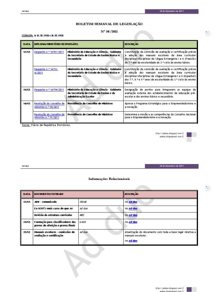 SEMANA: de 12/12/2011 a 16/12/2011 DATA 12/12 DIPLOMA/ MINISTRIO RESPONSVEL Despacho n. 16701/2011 Ministrio da Educao e Cincia - Gabinete da Secretria de Estado do Ensino Bsico e Secundrio DESCRIO Constituio da comisso de avaliao e certificao prvia adoo dos manuais escolares da rea curricular disciplinar/disciplinas de Lngua Estrangeira I e II (Francs) do 7. ano de escolaridade do 3. ciclo do ensino bsico. Constituio da comisso de avaliao e certificao prvia adoo dos manuais escolares da rea curricular disciplinar/disciplinas de Lngua Estrangeira I e II (Espanhol) dos 7., 8. e 9. anos de escolaridade do 3. ciclo do ensino bsico. Designao de peritos para integrarem as equipas de avaliao externa dos estabelecimentos de educao prescolar e dos ensinos bsico e secundrio. Aprova o Programa Estratgico para o Empreendedorismo e a Inovao. Determina a misso e as competncias do Conselho Nacional para o Empreendedorismo e a Inovao.