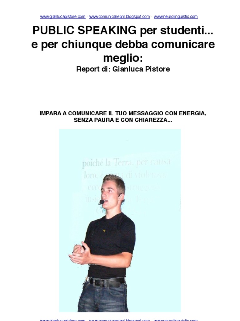 Sefinoadoggieritimidonelparlareinpubblicoti insegneradeliminarequellaorrendasensazione chetihafattostarmale,chetihaprovocatodei disagi,ituoimiglioramentinelPublicSpeakingsi vedrannogidadomani-setiimpegnerai-epotrai finalmentegestireunaconversazionepubblicacosa chemagarifinoadogginonerimairiuscitoafare oppuregisaifaremavuoimigliorare. Tiparlerdunquedicomegestireituoistati danimo,dellaProgrammazioneNeuroLinguistica, laneuroscienzachedaoltre30annistudia leccellenzaumanaetiinsegnerasfruttarelaPNL [Link] isegretideipigrandicomunicatoriinmodochetu possaimitarliediventarebravoquantoloro,o comunqueungrandeoratore;-) Dunquenonmirestacheaugurartiunabuona letturaesoprattuttodimettereimmediatamentein praticatuttoquellocheleggi,selotroviuna stupidaggineounabaggianata,questounvalido motivoperprovarlo,cospotraibasaresuqualcosa diveroeconcretolatuaidea,oppurepotrai ricredertietipotraiconvincerecheletecnichedi PublicSpeakingsonoefficaci. Buonlavoro, GianlucaPistore