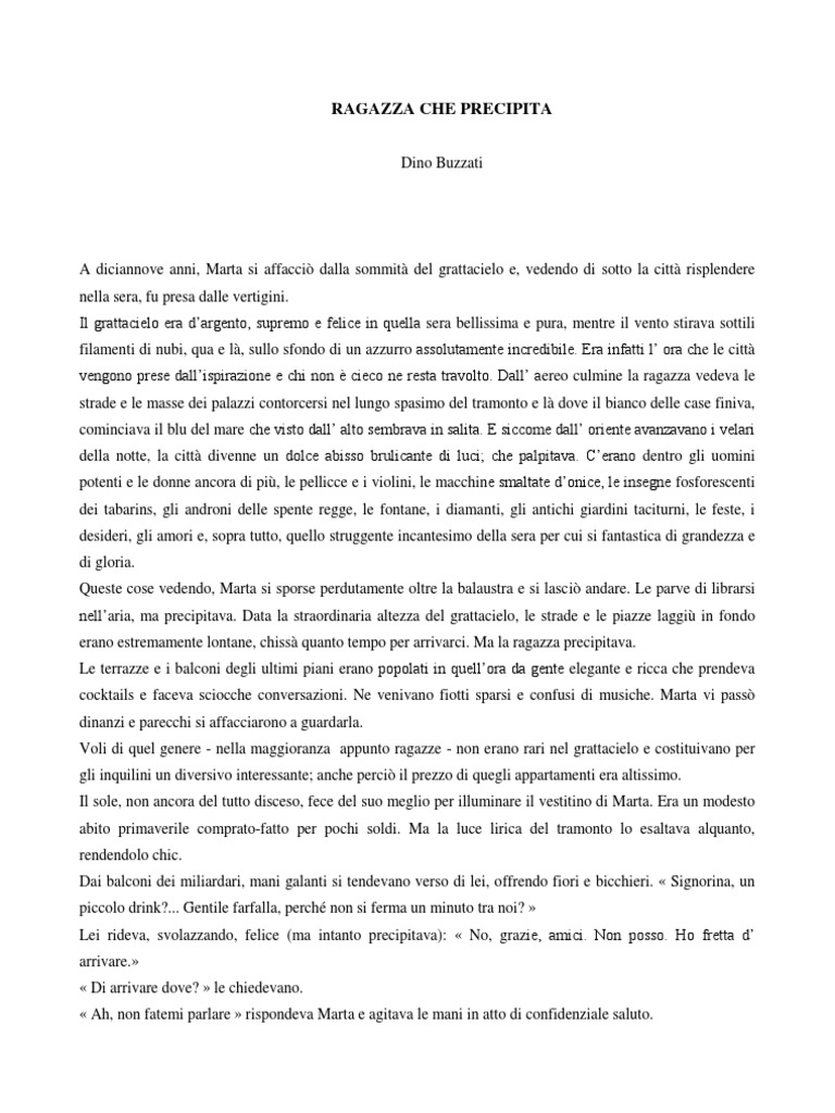 A diciannove anni, Marta si affacci dalla sommit del grattacielo e, vedendo di sotto la citt risplendere nella sera, fu presa dalle vertigini. Il grattacielo era dargento, supremo e felice in quella sera bellissima e pura, mentre il vento stirava sottili filamenti di nubi, qua e l, sullo sfondo di un azzurro assolutamente incredibile. Era infatti l ora che le citt vengono prese dallispirazione e chi non cieco ne resta travolto. Dall aereo culmine la ragazza vedeva le strade e le masse dei palazzi contorcersi nel lungo spasimo del tramonto e l dove il bianco delle case finiva, cominciava il blu del mare che visto dall alto sembrava in salita. E siccome dall oriente avanzavano i velari della notte, la citt divenne un dolce abisso brulicante di luci; che palpitava. Cerano dentro gli uomini potenti e le donne ancora di pi, le pellicce e i violini, le macchine smaltate donice, le insegne fosforescenti dei tabarins, gli androni delle spente regge, le fontane, i diamanti, gli antichi giardini taciturni, le feste, i desideri, gli amori e, sopra tutto, quello struggente incantesimo della sera per cui si fantastica di grandezza e di gloria. Queste cose vedendo, Marta si sporse perdutamente oltre la balaustra e si lasci andare. Le parve di librarsi nellaria, ma precipitava. Data la straordinaria altezza del grattacielo, le strade e le piazze laggi in fondo erano estremamente lontane, chiss quanto tempo per arrivarci. Ma la ragazza precipitava. Le terrazze e i balconi degli ultimi piani erano popolati in quellora da gente elegante e ricca che prendeva cocktails e faceva sciocche conversazioni. Ne venivano fiotti sparsi e confusi di musiche. Marta vi pass dinanzi e parecchi si affacciarono a guardarla. Voli di quel genere - nella maggioranza appunto ragazze - non erano rari nel grattacielo e costituivano per gli inquilini un diversivo interessante; anche perci il prezzo di quegli appartamenti era altissimo. Il sole, non ancora del tutto disceso, fece del suo meglio per illuminare il vestitino di Marta. Era un modesto abito primaverile comprato-fatto per pochi soldi. Ma la luce lirica del tramonto lo esaltava alquanto, rendendolo chic. Dai balconi dei miliardari, mani galanti si tendevano verso di lei, offrendo fiori e bicchieri. Signorina, un piccolo drink?... Gentile farfalla, perch non si ferma un minuto tra noi? Lei rideva, svolazzando, felice (ma intanto precipitava): No, grazie, amici. Non posso. Ho fretta d arrivare. Di arrivare dove? le chiedevano. Ah, non fatemi parlare rispondeva Marta e agitava le mani in atto di confidenziale saluto.