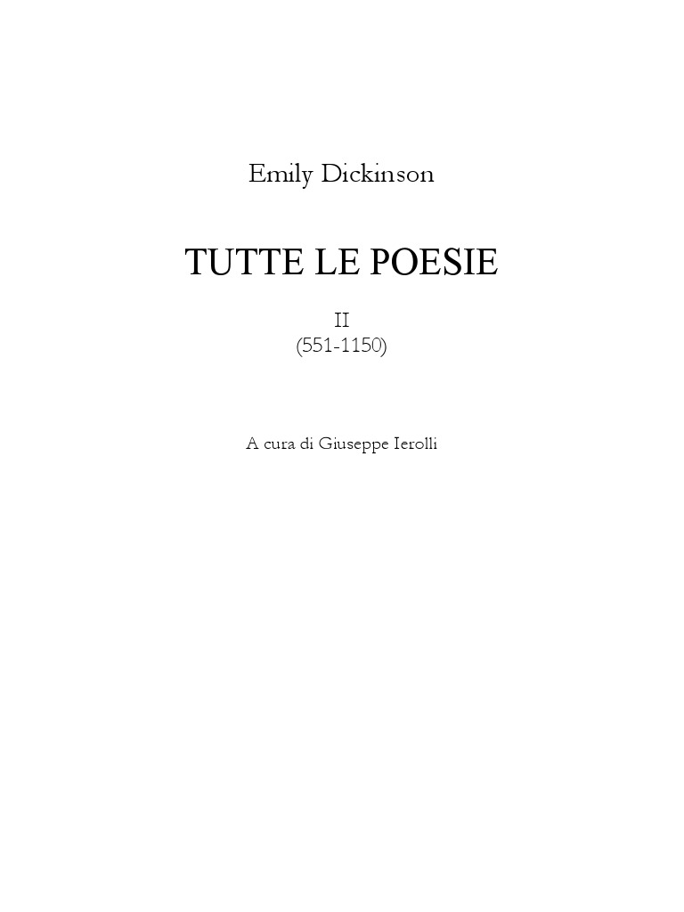 N Fame - aveva - n una Locanda Per provvedere - alla sua Toeletta N Impegno - n Interesse Per i piccoli Misteri Che ci tormentano - come la Vita - e la Morte E il Dopo - o il Nulla Ma sembrava assorbita nell'Assoluto Insieme al Luccichio - e al Cielo Il privilegio di scrutarla Fu di breve durata per i miei Occhi Dal momento che, con Argentea abilit Volteggi fuori di Vista E dopo - la ritrovai su una Nuvola Troppo lontana io gi in basso Per inseguire il suo Superiore Cammino O il suo Vantaggio - Blu F594 - J1181 (1863-1862) Mentre speravo - temevo Dopo - aver sperato - osai Dovunque - da sola Come di una chiesa - i resti Uno spirito - pu non allarmare Un serpente - pu non incantare Re del Male Chi l'ha sofferto F595 - J630 (1863-1862) Il Lampo suona - per tutto il tempo Ma quando canta - allora Siamo consapevoli che Egli esiste E ci avviciniamo a Lui - austeri Con Isolanti - e un Guanto Il suo breve - sepolcrale Basso Ci allarma - sebbene i Suoi piedi Gialli Passino - e contropassino []