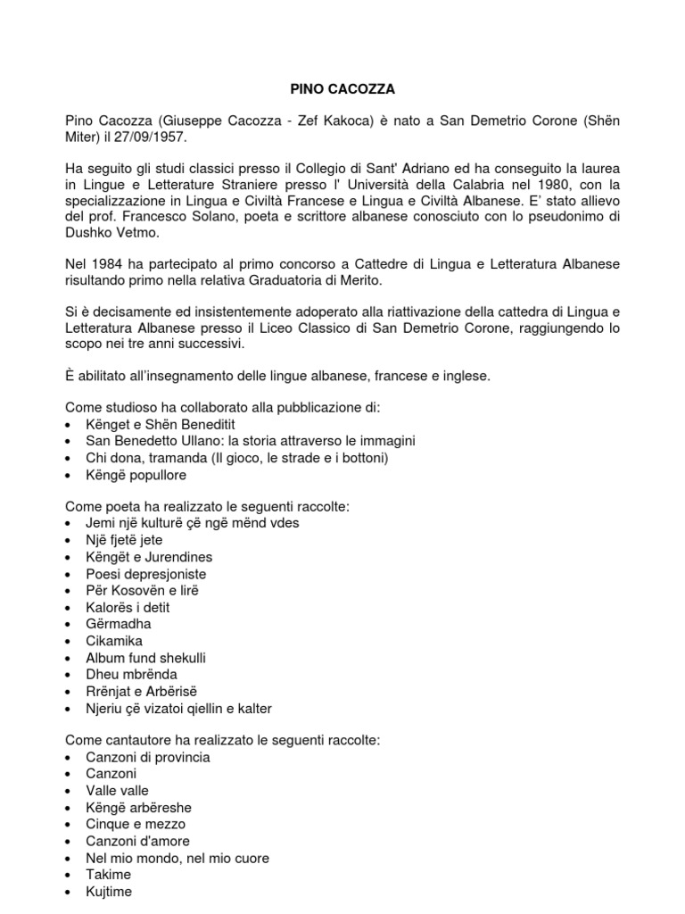 DETTAGLI Come autore, compositore e cantante ha vinto per 6 volte il Festival della Canzone Arbreshe (Nel 1984 con la canzone Ajri i jetes di cui coautore della parte letteraria - Nel 1985 con Jemi nj kultur ng mnd vdes Nel 1986 con Me nj mik afer Nel 1988 con Kjo sht festa m e madhe ka Arbria Nel 2004 con la canzone E bukura vashes, e bukura gjitoni) Nel 2008 insieme ad Ernesto Iannuzzi e Jessika Novello con la canzone Ishe nj her, 4 volte il Premio della Critica G. DAmico ed ha ottenuto quasi sempre piazzamenti donore (3 secondi posti e 5 terzi posti). E' stato pi volte in Albania, sia per seguire corsi di specializzazione organizzati dalla Universit di Tirana (1976-1980), sia per partecipare a varie edizioni del Festival del Folklore di Argirocastro (1976 1982 - 1988) e al Festival della Canzone Albanese del 1992 (Prima partecipazione di un cantante arbresh). Nel 1977 scrive la raccolta poetica Nj fjet jete. Nel 1983 scrive la raccolta poetica e canora Kngt e Jurendines con lintenzione di realizzarla con il gruppo Cooperativa Musicale Arbreshe. Nel 1984 con la canzone Ajri i jetes di cui coautore della parte letteraria (la versione italiana della poetessa Anna Ventre), cantata da Annalisa De Marco, vince il Festival della Canzone Arbreshe. Nel 1984 pubblica con la Cooperativa Musicale Arbreshe la musicassetta Valle Valle con rielaborazioni di canti popolari arbresh, dAlbania e tre canzoni nuove da lui scritte (Valle valle, Kndomi bashk e Mandulli). Nel 1985 ideatore ed organizzatore di "Pisepiselle", il Festival dei Piccoli Cantori Arbresh, manifestazione che si rinnover negli anni successivi e fino al 1990. Nel 1985 con la canzone Jemi nj kultur ng mnd vdes , cantata insieme al Gruppo 85 da lui formato per loccasione, vince il Festival della Canzone Arbreshe. Sue canzoni e poesie sono state pubblicate in altre edizioni di musicassette (Le pi belle canzoni del Festival della Canzone Arbreshe, cassetta prodotta dal Comitato Storico Festival Arbresh di San Demetrio Corone), in altri CD (Raccolte delle canzoni partecipanti a varie edizioni del Festival della Canzone Arbreshe prodotte dallAmministrazione Comunale di San Demetrio Corone) e in diverse riviste albanesi e non, nelle quali sono stati pubblicati anche alcuni suoi studi su tematiche linguistiche e letterarie. Sue poesie figurano nell "Antologia della poesia contemporanea italo-albanese, curata dal prof. Anton Nik Berisha e pubblicata sia in Italia che in Albania. [Link], Antologji e poezis bashkkohore arbreshe, Centro Editoriale e Librario, Universit degli Studi della Calabria, 1999. [Link], Antologji e poezis bashkkohore i arbresheve t Italis, Msonjtarja e par, Tiran, 2001. Nel 1986 vince una borsa di studio allUniversit degli Studi della Calabria e svolge attivit di ricerca nel campo antropologico e linguistico in collaborazione con il prof. Mario