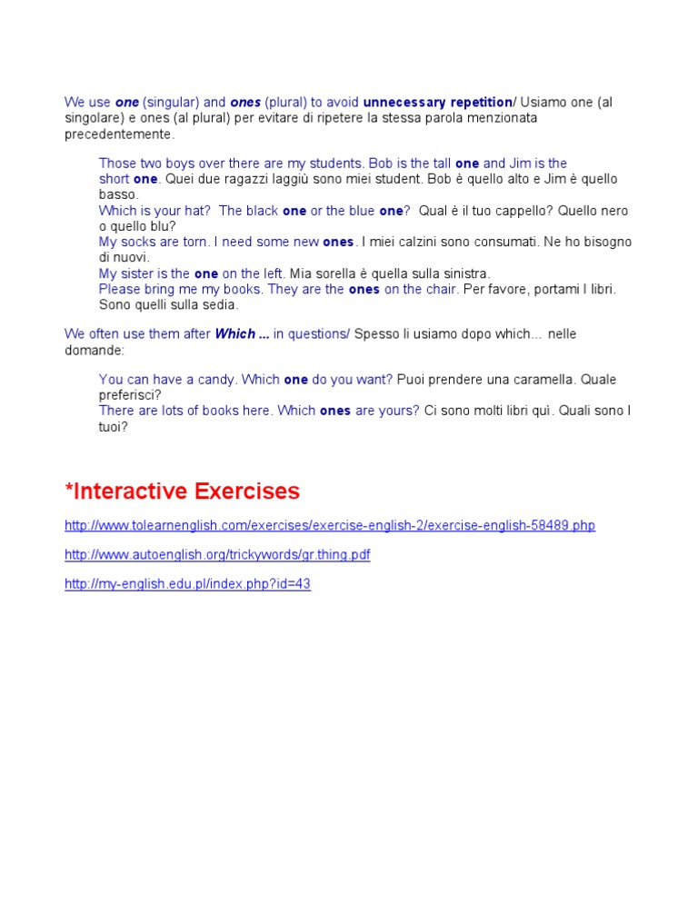 plural) per evitare di ripetere la stessa parola menzionata precedentemente. Those two boys over there are my students. Bob is the tall one and Jim is the short one. Quei due ragazzi laggi sono miei student. Bob quello alto e Jim quello basso. Which is your hat? The black one or the blue one? Qual il tuo cappello? Quello nero o quello blu? My socks are torn. I need some new ones. I miei calzini sono consumati. Ne ho bisogno di nuovi. My sister is the one on the left. Mia sorella quella sulla sinistra. Please bring me my books. They are the ones on the chair. Per favore, portami I libri. Sono quelli sulla sedia. We often use them after Which ... in questions/ Spesso li usiamo dopo which nelle domande: You can have a candy. Which one do you want? Puoi prendere una caramella. Quale preferisci? There are lots of books here. Which ones are yours? Ci sono molti libri qu. Quali sono I tuoi?