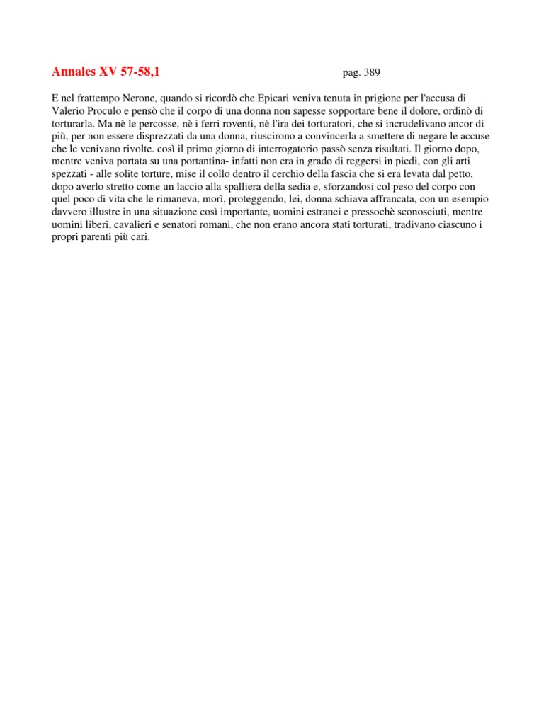 E nel frattempo Nerone, quando si ricord che Epicari veniva tenuta in prigione per l'accusa di Valerio Proculo e pens che il corpo di una donna non sapesse sopportare bene il dolore, ordin di torturarla. Ma n le percosse, n i ferri roventi, n l'ira dei torturatori, che si incrudelivano ancor di pi, per non essere disprezzati da una donna, riuscirono a convincerla a smettere di negare le accuse che le venivano rivolte. cos il primo giorno di interrogatorio pass senza risultati. Il giorno dopo, mentre veniva portata su una portantina- infatti non era in grado di reggersi in piedi, con gli arti spezzati - alle solite torture, mise il collo dentro il cerchio della fascia che si era levata dal petto, dopo averlo stretto come un laccio alla spalliera della sedia e, sforzandosi col peso del corpo con quel poco di vita che le rimaneva, mor, proteggendo, lei, donna schiava affrancata, con un esempio davvero illustre in una situazione cos importante, uomini estranei e pressoch sconosciuti, mentre uomini liberi, cavalieri e senatori romani, che non erano ancora stati torturati, tradivano ciascuno i propri parenti pi cari.