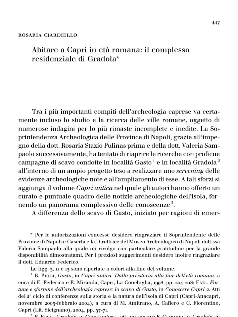 Tra i piu importanti compiti dell'archeologia caprese va certamente incluso lo studio e la ricerca delle ville romane, oggetto di numerose indagini per lo piu rimaste incomplete e inedite. La Soprintendenza Archeologica delle Province di Napoli, grazie all'impegno della dott. Rosaria Stazio Pulinas prima e della dott. Valeria Sampaolo successivamente, ha tentato di riaprire le ricerche con proficue campagne di scavo condotte in localita Gasto 1 e in localita Gradola 2 all'interno di un ampio progetto teso a realizzare uno screening delle evidenze archeologiche note e all'ampliamento di esse. A tali sforzi si aggiunga il volume Capri antica nel quale gli autori hanno offerto un curato e puntuale quadro delle notizie archeologiche dell'isola, fornendo un panorama complessivo delle conoscenze 3. A differenza dello scavo di Gasto, iniziato per ragioni di emer* Per le autorizzazioni concesse desidero ringraziare il Soprintendente delle Province di Napoli e Caserta e la Direttrice del Museo Archeologico di Napoli [Link] Valeria Sampaolo alla quale mi rivolgo con particolare gratitudine per la grande disponibilita dimostratami. Per i preziosi suggerimenti desidero inoltre ringraziare il dott. Eduardo Federico. Le figg. 3, 11 e 13 sono riportate a colori alla fine del volume. 1 R. Belli, Gasto, in Capri antica. Dalla preistoria alla fine dell'eta romana, a cura di E. Federico e E. Miranda, Capri, La Conchiglia, 1998, pp. 204-208; Ead., Fortune e sfortune dell'archeologia caprese: lo scavo di Gasto, in Conoscere Capri 2. Atti del 2 ciclo di conferenze sulla storia e la natura dell'isola di Capri (Capri-Anacapri, novembre 2003-febbraio 2004), a cura di M. Amitrano, A. Cafiero e C. Fiorentino, Capri (Lit. Sicignano), 2004, pp. 57-71. 2 R. Belli, Gradola, in Capri antica... cit., pp. 213-215; R. Ciardiello, Gradola, in Guida geoarcheologica della costa campana ad uso dei naviganti, a cura di U. Pappalardo e R. Ciardiello, Napoli, Valtrend Editore, 2005, pp. 161-162. 3 Capri antica..., cit. Di recente e apparso anche il prezioso contributo di C. Krause, Villa Jovis. L'edificio residenziale, Napoli, Electa, 2005 che contribuisce in maniera determinante a chiarire la cronologia e le fasi di Villa Jovis nonche a restituirne una nuova visione.