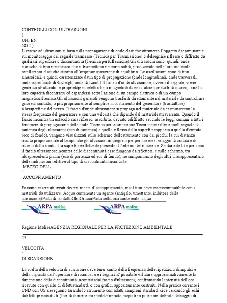 Regione MoliseAGENZIA REGIONALE PER LA PROTEZIONE AMBIENTALE ________________________________________________________________________________ 27 VELOCITA DI SCANSIONE La scelta della velocit di scansione deve tener conto della frequenza delle ripetizioni diimpulsi e della capacit delloperatore di riconoscere i segnali.E' possibile valutare approssimativamente la dimensione della discontinuit incontratadal fascio d'ultrasuoni, confrontando l'intensit dell'eco ricevuto con quello di difettistandard, o con grafici appositamente costruiti. Nella pratica corrente i CND con US sieseguono tarando lo strumento con adatti campioni standard, cio cercando gli echi didifetti precostituiti (fori di dimensioni predeterminate eseguiti in posizioni definite delsaggio di
