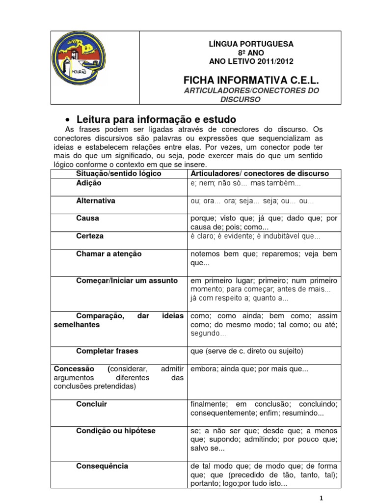 FICHA DE TRABALHO/ ARTICULADORES/CONECTORES DO DISCURSO CORREO Exerccio 1 Transformao de frases, substituindo o articulador sublinhado por outro indicado. Tia Maria no temia a chuva dado acreditar na sabedoria da Natureza. Como a terra tem grande urgncia da visita da chuva, esta abenoada. Dado que os indgenas acreditavam que a chuva era uma ddiva dos deuses, estes eram ofertados com as danas que aqueles lhes dedicavam. Uma vez que (chegou) o fim da guerra, a chuva vem lavar a terra do sangue derramado. Visto se anunciar um novo tempo, Tia Maria achava que o patro devia usar fato. Exerccio 2 Ligao de duas oraes com as relaes de: - tempo: Quando a Maria vai s compras, encontra a Ana. - condio: Se a Maria for s compras encontrar a Ana. - concesso: Apesar da Maria ter ido s compras no encontrou a Ana. - oposio: A Maria vai s compras, mas no encontra a Ana. - concluso: A Maria vai s compras, logo encontrar a Ana. - adio: A Maria vai s compras e encontra a Ana. Exerccio 3 Reescrio das frases, substituindo o articulador adversativo por um outro de lgica concessiva. Embora o ambiente se encontre degradado, ningum se preocupa com o facto. Apesar da m qualidade dos programas televisivos ser uma realidade, o ndice de audincias aumenta assustadoramente. Ainda que o tempo apague as recordaes, a memria recupera-as. Mesmo que as touradas sejam uma prtica brbara, h sempre pblico vido de sangue na arena. Exerccio 4 Construo de frases complexas recorrendo a articuladores de tipo consecutivo. O homem sentia-se de tal modo humilhdo que preferia morrer. O furor nas touradas tanto que os animais se sentem apavorados. As crianas so to especiais que conseguem criar empatia com adultos sensveis. Os adultos so to complicados que prefervel conviver com as crianas.