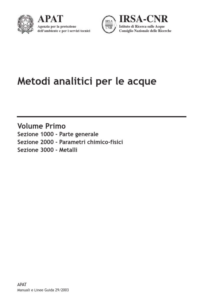 Il manuale Metodi Analitici per le Acque pubblicato nella serie editoriale Manuali e Linee Guida dellAgenzia per la Protezione dellAmbiente e per i Servizi Tecnici (APAT). Lopera si articola in tre volumi, suddivisi in sezioni (da 1000 a 9040). Fatta eccezione per la parte generale (sezioni 1000-1040), ogni sezione contiene uno o pi metodi, costituiti da capitoli, paragra e sottoparagra. I metodi analitici riportati nel manuale sono stati elaborati da una Commissione istituita nel 1996 dallIstituto di Ricerca sulle Acque del Consiglio Nazionale delle Ricerche (IRSA-CNR), per laggiornamento e lampliamento dei metodi riportati nel Quaderno 100 Metodi analitici per le acque, pubblicato dallIRSA-CNR ed edito dal Poligraco dello Stato nel 1994. Un Gruppo di Lavoro, coordinato dallAPAT, e formato dal Servizio di Metrologia Ambientale dellAPAT, dallIstituto di Ricerca sulle Acque del Consiglio Nazionale delle Ricerche (IRSACNR), dalle Agenzie Regionali per la Protezione dellAmbiente (ARPA) e dalle Agenzie Provinciali per la Protezione dellAmbiente (APPA), con il contributo del Centro Tematico Nazionale Acque interne e marino costiere (CTN/AIM), ha provveduto ad una revisione critica e ad una integrazione dei metodi analitici prodotti dalla Commissione istituita dallIRSA-CNR. I metodi analitici riportati nel presente manuale possono essere riprodotti ed utilizzati purch ne sia citata la fonte.