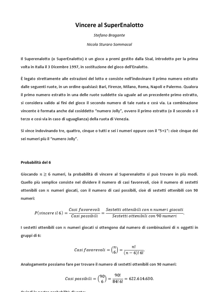 Stefano Bragante Nicola Sturaro Sommacal Il Superenalotto (o SuperEnalotto) un gioco a premi gestito dalla Sisal, introdotto per la prima volta in Italia il 3 Dicembre 1997, in sostituzione del gioco dell'Enalotto. legato strettamente alle estrazioni del lotto e consiste nell'indovinare il primo numero estratto dalle seguenti ruote, in un ordine qualsiasi: Bari, Firenze, Milano, Roma, Napoli e Palermo. Qualora il primo numero estratto in una delle ruote suddette sia uguale ad un precedente primo estratto, si considera valido ai fini del gioco il secondo numero di tale ruota e cos via. La combinazione vincente formata anche dal cosiddetto numero Jolly, ovvero il primo estratto (o il secondo o il terzo e cos via in caso di uguaglianza) della ruota di Venezia. Si vince indovinando tre, quattro, cinque o tutti e sei i numeri oppure con il 5+1: cio cinque dei sei numeri pi il numero Jolly.