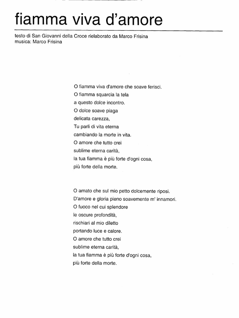 O fiamma vivad'amore soave che ferisci. O fiamma squarcia tela la a questo dolceincontro. O dolcesoavepiaga delicata carezza, Tu parlidi vitaeterna cambiando morte vita. la in O amoreche tuttocrei sublime eterna carit, la tua fiamma piforted'ogni e cosa, pifortedellamorte.