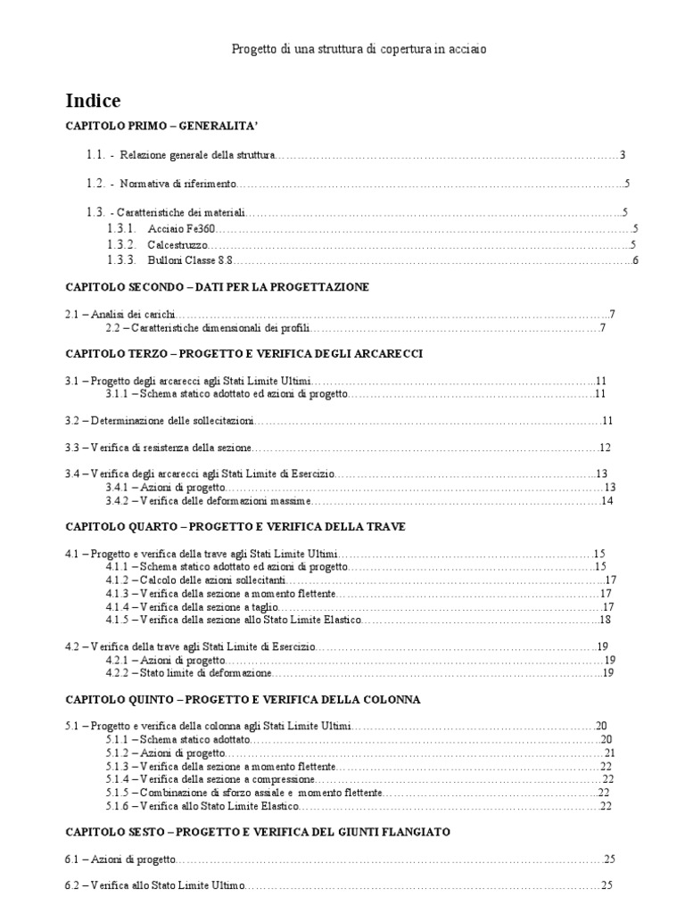 CAPITOLO SECONDO DATI PER LA PROGETTAZIONE 2.1 Analisi dei carichi...7 2.2 Caratteristiche dimensionali dei profili.7 CAPITOLO TERZO PROGETTO E VERIFICA DEGLI ARCARECCI 3.1 Progetto degli arcarecci agli Stati Limite Ultimi...11 3.1.1 Schema statico adottato ed azioni di progetto..11 3.2 Determinazione delle sollecitazioni.11 3.3 Verifica di resistenza della sezione.12 3.4 Verifica degli arcarecci agli Stati Limite di Esercizio...13 3.4.1 Azioni di progetto13 3.4.2 Verifica delle deformazioni massime.14 CAPITOLO QUARTO PROGETTO E VERIFICA DELLA TRAVE 4.1 Progetto e verifica della trave agli Stati Limite Ultimi.15 4.1.1 Schema statico adottato ed azioni di progetto..15 4.1.2 Calcolo delle azioni sollecitanti...17 4.1.3 Verifica della sezione a momento flettente17 4.1.4 Verifica della sezione a taglio.17 4.1.5 Verifica della sezione allo Stato Limite Elastico...18 4.2 Verifica della trave agli Stati Limite di Esercizio..19 4.2.1 Azioni di progetto19 4.2.2 Stato limite di deformazione...19 CAPITOLO QUINTO PROGETTO E VERIFICA DELLA COLONNA 5.1 Progetto e verifica della colonna agli Stati Limite Ultimi.20 5.1.1 Schema statico adottato..20 5.1.2 Azioni di progetto21 5.1.3 Verifica della sezione a momento flettente22 5.1.4 Verifica della sezione a compressione22 5.1.5 Combinazione di sforzo assiale e momento flettente...22 5.1.6 Verifica allo Stato Limite Elastico.22 CAPITOLO SESTO PROGETTO E VERIFICA DEL GIUNTI FLANGIATO 6.1 Azioni di progetto.25 6.2 Verifica allo Stato Limite Ultimo25
