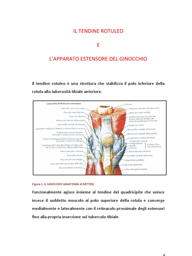 Il tendine rotuleo insieme al muscolo quadricipite, al tendine quadricipitale, alla rotula e alla tuberosit tibiale anteriore costituisce lapparato estensore del ginocchio. La rotula risulta inglobata e avvolta in un tessuto connettivo molto resistente che congiunge le fibre muscolari del quadricipite alla tuberosit anteriore della tibia.