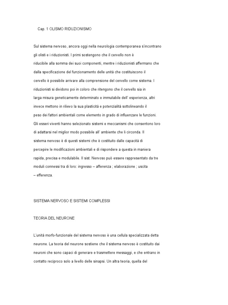 Sul sistema nervoso, ancora oggi nella neurologia contemporanea sincontrano gli olisti e i riduzionisti. I primi sostengono che il cervello non riducibile alla somma dei suoi componenti, mentre i riduzionisti affermano che dalla specificazione del funzionamento delle unit che costituiscono il cervello possibile arrivare alla comprensione del cervello come sistema. I riduzionisti si dividono poi in coloro che ritengono che il cervello sia in larga misura geneticamente determinato e immutabile dell esperienza, altri invece mettono in rilievo la sua plasticit e potenzialit sottolineando il peso dei fattori ambientali come elemento in grado di influenzare le funzioni. Gli esseri viventi hanno selezionato sistemi e meccanismi che consentono loro di adattarsi nel miglior modo possibile all ambiente che li circonda. Il sistema nervoso di questi sistemi che costituito dalle capacit di percepire le modificazioni ambientali e di rispondere a questa in maniera rapida, precisa e modulabile. Il sist. Nervoso pu essere rappresentato da tre moduli connessi tra di loro: ingresso afferenza ; elaborazione ; uscita efferenza.