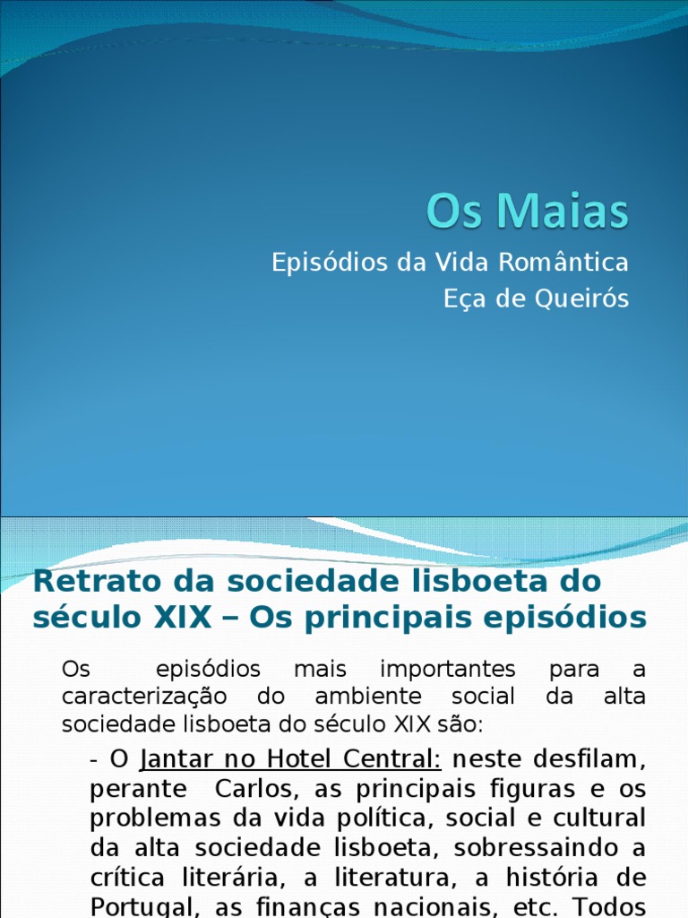 - O Jantar no Hotel Central: neste desfilam, perante Carlos, as principais figuras e os problemas da vida poltica, social e cultural da alta sociedade lisboeta, sobressaindo a crtica literria, a literatura, a histria de Portugal, as finanas nacionais, etc. Todos estes problemas so objecto de discusso e o evento acaba em desacato, o que vem denunciar a fragilidade moral dessa