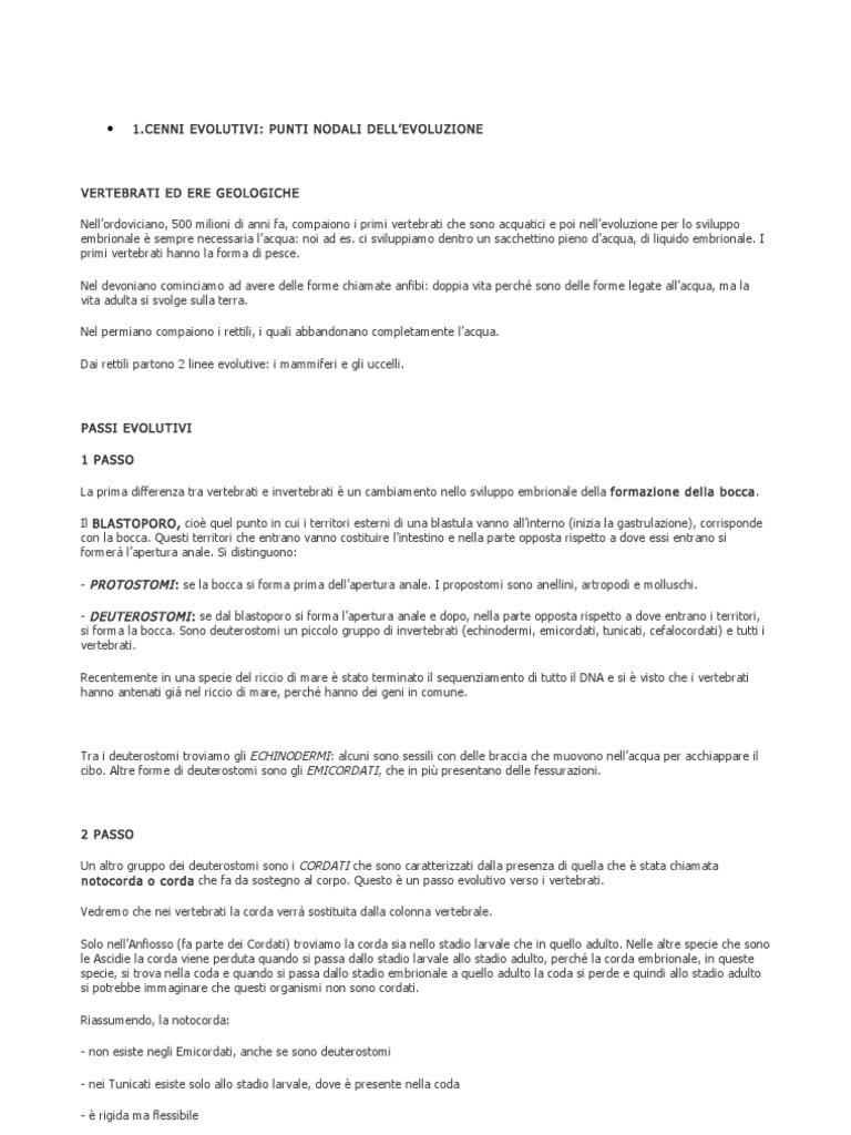 - di sostegno al corpo ed resistente alle compressioni muscolari: se i muscoli si contraggono non si accorcia e il corpo si piega - presente nel corpo e nella coda dei Cefalocordati - fatta da cellule che hanno vacuoli pieni di acqua e contengono fibrille di paramiosina (una molecola proteica che pu contrarsi). Quando questa si contrae, le cellule diventano pi turgide e quindi la corda pi tesa o meno tesa: ecco come fa da sostegno. Anche noi siamo Cordati perch in uno stadio embrionale abbiamo la corda (serve quasi a pianificare la lunghezza, la struttura dellembrione) che poi scomparir e si formeranno le vertebre che nellinsieme formeranno la colonna vertebrale. Allora noi siamo Deuterostomi, Cordati e Vertebrati.
