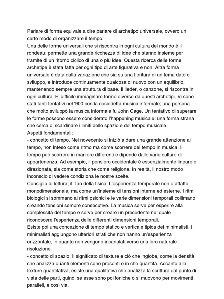 Una delle forme universali che si riscontra in ogni cultura del mondo il rondeau: permette una grande ricchezza di idee che stanno insieme per tramite di un ritorno ciclico di una o pi idee. Questa ricerca delle forme archetipe stata fatta per ogni tipo di arte figurativa e non. Altra forma universale data dalla variazione che sia su una fioritura di un tema dato o sviluppo, e introduce continuamente qualcosa di nuovo con un equilibrio, mantenendo sempre una struttura di base. Il lieder, o canzone, si riscontra in ogni cultura. E' difficile immaginare forme diverse da questi archetipi. Vi sono stati tanti tentativi nel '900 con la cosiddetta musica informale; una persona che molto svilupp la musica informale fu John Cage. Un tentativo di superare le forme possono essere considerato l'happening musicale: una forma strana che cerca di scardinare i limiti dello spazio e del tempo musicale. Aspetti fondamentali: - concetto di tempo. Nel novecento si inizi a dare una grande attenzione al tempo, non inteso come ritmo ma come scorrere del tempo in musica. Il tempo pu scorrere in maniere differenti e dipende dalle varie culture di appartenenza. Ad esempio, il pensiero occidentale essenzialmente lineare e direzionata, sia come storia che come religione. In realt, il nostro modo inconscio di vedere condiziona le nostre scelte. Consiglio di lettura, il Tao della fisica. L'esperienza temporale non affatto monodimensionale, ma come un'insieme di tensioni interne ed esterne. I ritmi biologici si sommano ai ritmi psichici e le varie dimensioni temporali collimano creando tensioni sempre consecutive. La musica serve per esperire alla complessit del tempo e serve per creare un precedente nel quale riconoscere l'esperienza delle differenti dimensioni temporali. Esiste poi una concezione di tempo statico e verticale tipica dei minimalisti. I minimalisti aggiungono ulteriori strati che non hanno un'esperienza orizzontale, in quanto non vengono incanalati verso una loro naturale risoluzione. - concetto di spazio. Il significato di texture e ci che ingloba, come la densit che analizza quanti elementi sono presenti e in che quantit. Accanto alla texture quantitativa, esiste una qualitativa che analizza la scrittura dal punto di vista delle parti, quindi se esse sono polifoniche o si muovono per movimenti paralleli, e cos via.