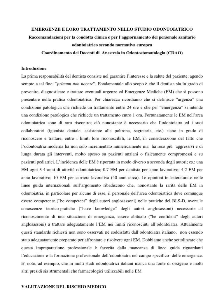 Introduzione La prima responsabilit del dentista consiste nel garantire linteresse e la salute del paziente, agendo sempre a tal fine: primum non nocere. Fondamentale allo scopo che il dentista sia in grado di prevenire, diagnosticare e trattare eventuali urgenze ed Emergenze Mediche (EM) che si possono presentare nella pratica odontoiatrica. Per chiarezza ricordiamo che si definisce urgenza una condizione patologica che richiede un trattamento entro 24 ore e che per emergenza si intende una condizione patologica che richiede un trattamento entro 1 ora. Fortunatamente le EM nellarea odontoiatrica sono di raro riscontro; ci nonostante necessario che lodontoiatra ed i suoi collaboratori (igienista dentale, assistente alla poltrona, segretaria, etc.) siano in grado di riconoscere e trattare, entro i limiti loro riconoscibili, le EM, in considerazione del fatto che lodontoiatria moderna ha non solo incrementato numericamente ma ha reso pi aggressivi e di lunga durata gli interventi, molto spesso su pazienti anziani o fisicamente compromessi e su pazienti pediatrici. Lincidenza delle EM riportata in modo diverso a seconda degli autori; es.: una EM ogni 3-4 anni di attivit odontoiatrica; 0.7 EM per dentista per anno lavorativo; 4.2 EM per anno lavorativo; 10 EM per carriera lavorativa (40 anni circa). Le opinioni in letteratura e nelle linee guida internazionali sullargomento ribadiscono che, nonostante la rarit delle EM in odontoiatria, in particolare per alcune di esse, il personale dellarea odontoiatrica deve comunque essere competente (be competent degli autori anglosassoni) nelle pratiche del BLS-D, avere le conoscenze teorico-pratiche (have knowledge degli autori anglosassoni) necessarie al riconoscimento di una situazione di emergenza, essere abituato (be confident degli autori anglosassoni) a trattare adeguatamente lEM nei limiti riconosciuti allodontoiatra. Attualmente questi standards richiesti non sono osservati n soddisfatti dallodontoiatra italiano, non essendo stato adeguatamente preparato per affrontare e risolvere ogni EM. Dobbiamo anche sottolineare che questa impreparazione professionale favorita dalla mancanza di linee guida riguardanti leducazione e la formazione professionale dellodontoiatra nel campo specifico delle emergenze. E noto, ad esempio, che in molti studi odontoiatrici italiani manca una fonte di ossigeno e molti altri presidi sia strumentali che farmacologici utilizzabili nelle EM.