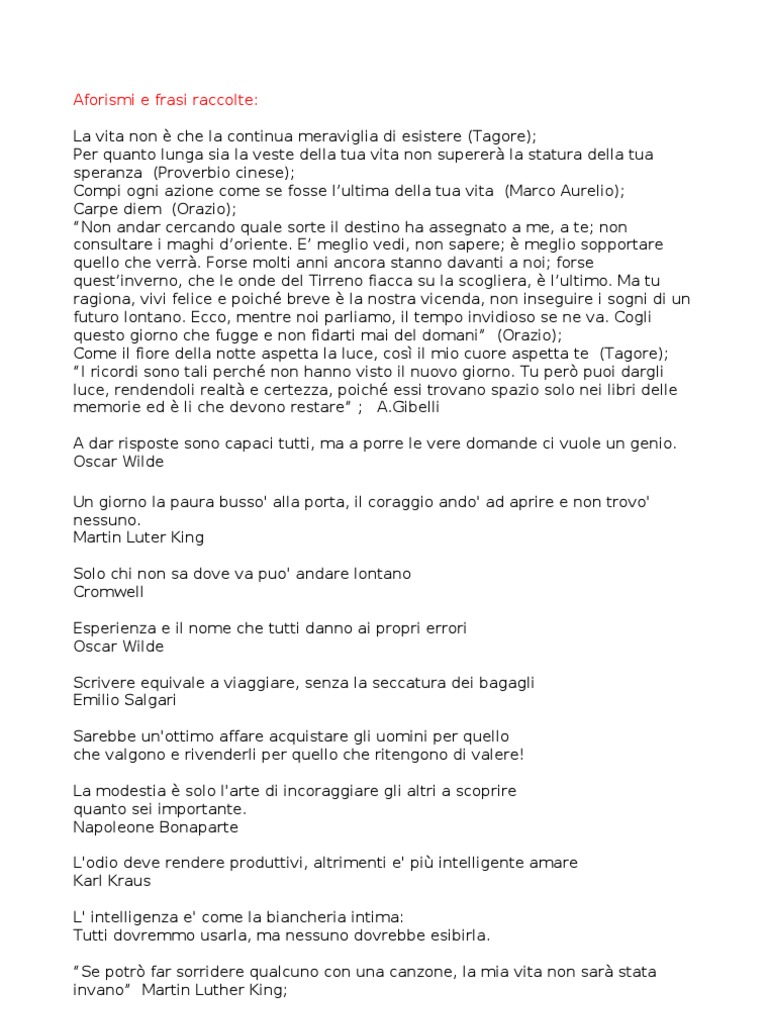 e della tua vita non superer la statura della tua speranza (Proverbio cinese); Compi ogni azione come se fosse lultima della tua vita (Marco Aurelio); Carpe diem (Orazio); Non andar cercando quale sorte il destino ha assegnato a me, a te; non consultare i maghi doriente. E meglio vedi, non sapere; meglio sopportare quello che verr. Forse molti anni ancora stanno davanti a noi; forse questinverno, che le onde del Tirreno fiacca su la scogliera, lultimo. Ma tu ragiona, vivi felice e poich breve la nostra vicenda, non inseguire i sogni di un futuro lontano. Ecco, mentre noi parliamo, il tempo invidioso se ne va. Cogli questo giorno che fugge e non fidarti mai del domani (Orazio); Come il fiore della notte aspetta la luce, cos il mio cuore aspetta te (Tagore); I ricordi sono tali perch non hanno visto il nuovo giorno. Tu per puoi dargli luce, rendendoli realt e certezza, poich essi trovano spazio solo nei libri delle memorie ed li che devono restare ; [Link] A dar risposte sono capaci tutti, ma a porre le vere domande ci vuole un genio. Oscar Wilde Un giorno la paura busso' alla porta, il coraggio ando' ad aprire e non trovo' nessuno. Martin Luter King Solo chi non sa dove va puo' andare lontano Cromwell Esperienza e il nome che tutti danno ai propri errori Oscar Wilde Scrivere equivale a viaggiare, senza la seccatura dei bagagli Emilio Salgari Sarebbe un'ottimo affare acquistare gli uomini per quello che valgono e rivenderli per quello che ritengono di valere! La modestia solo l'arte di incoraggiare gli altri a scoprire quanto sei importante. Napoleone Bonaparte L'odio deve rendere produttivi, altrimenti e' pi intelligente amare Karl Kraus L' intelligenza e' come la biancheria intima: Tutti dovremmo usarla, ma nessuno dovrebbe esibirla. Se potr far sorridere qualcuno con una canzone, la mia vita non sar stata invano Martin Luther King;