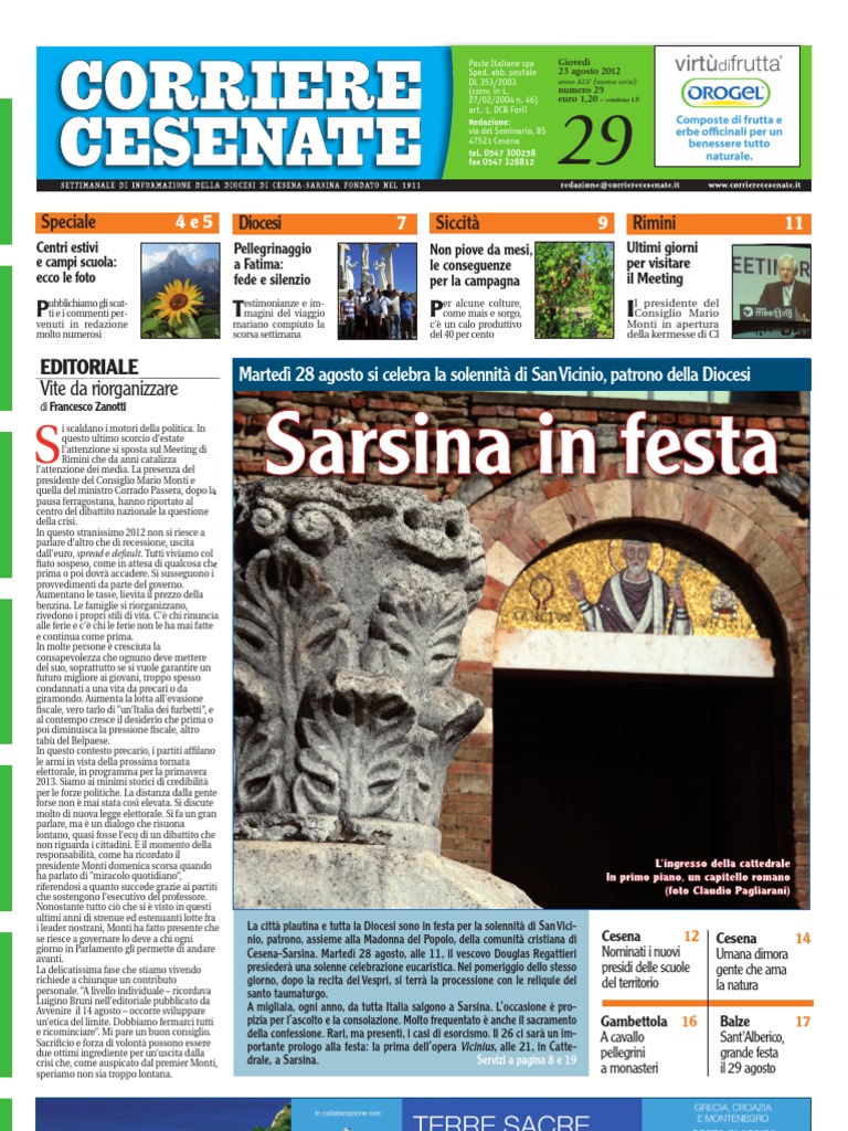 Redazione via del Seminario, 85, 47521 Cesena (Fc) tel. 0547 300258, fax 0547 328812, [Link] Segreteria e Amministrazione corso Sozzi, 39, Palazzo Ghini, Cesena, tel. e fax 0547 27234. Orario: feriali ore 9-11,30. Conto corrente postale n. 14191472 E-mail: redazione@[Link] Abbonamenti annuo ordinario euro 45; sostenitore 70 euro; di amicizia 100 euro; estero (via aerea) 80 euro. Settimanale dinformazione Autorizz. Trib. Forl n. 409, 20/2/68 Iscrizione al Registro nazionale della stampa n. 4.234 Editore e Propriet Diocesi di Cesena-Sarsina Stampa Galeati Industrie Grafiche spa [Link] via Selice, 187/189 - 40026 Imola