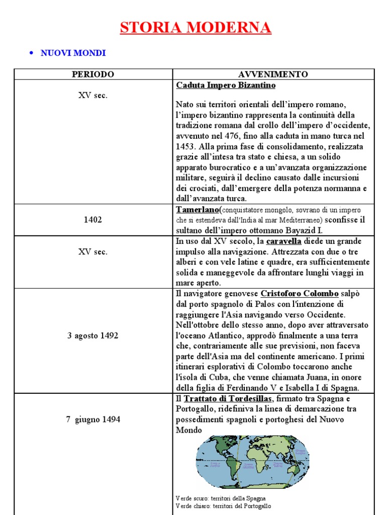 NUOVI MONDI PERIODO XV sec. AVVENIMENTO Caduta Impero Bizantino Nato sui territori orientali dellimpero romano, limpero bizantino rappresenta la continuit della tradizione romana dal crollo dellimpero doccidente, avvenuto nel 476, fino alla caduta in mano turca nel 1453. Alla prima fase di consolidamento, realizzata grazie allintesa tra stato e chiesa, a un solido apparato burocratico e a unavanzata organizzazione militare, seguir il declino causato dalle incursioni dei crociati, dallemergere della potenza normanna e dallavanzata turca. Tamerlano(conquistatore mongolo, sovrano di un impero che si estendeva dall'India al mar Mediterraneo) sconfisse il sultano dellimpero ottomano Bayazid I. In uso dal XV secolo, la caravella diede un grande impulso alla navigazione. Attrezzata con due o tre alberi e con vele latine e quadre, era sufficientemente solida e maneggevole da affrontare lunghi viaggi in mare aperto. Il navigatore genovese Cristoforo Colombo salp dal porto spagnolo di Palos con l'intenzione di raggiungere l'Asia navigando verso Occidente. Nell'ottobre dello stesso anno, dopo aver attraversato l'oceano Atlantico, approd finalmente a una terra che, contrariamente alle sue previsioni, non faceva parte dell'Asia ma del continente americano. I primi itinerari esplorativi di Colombo toccarono anche l'isola di Cuba, che venne chiamata Juana, in onore della figlia di Ferdinando V e Isabella I di Spagna. Il Trattato di Tordesillas, firmato tra Spagna e Portogallo, ridefiniva la linea di demarcazione tra possedimenti spagnoli e portoghesi del Nuovo Mondo