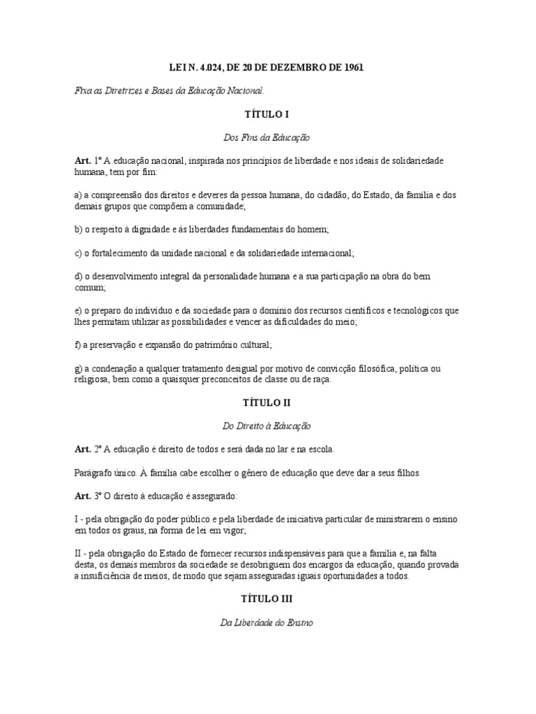 1 A educao nacional, inspirada nos princpios de liberdade e nos ideais de solidariedade humana, tem por fim: a) a compreenso dos direitos e deveres da pessoa humana, do cidado, do Estado, da famlia e dos demais grupos que compem a comunidade; b) o respeito dignidade e s liberdades fundamentais do homem; c) o fortalecimento da unidade nacional e da solidariedade internacional; d) o desenvolvimento integral da personalidade humana e a sua participao na obra do bem comum; e) o preparo do indivduo e da sociedade para o domnio dos recursos cientficos e tecnolgicos que lhes permitam utilizar as possibilidades e vencer as dificuldades do meio; f) a preservao e expanso do patrimnio cultural; g) a condenao a qualquer tratamento desigual por motivo de convico filosfica, poltica ou religiosa, bem como a quaisquer preconceitos de classe ou de raa. TTULO II Do Direito Educao Art. 2 A educao direito de todos e ser dada no lar e na escola. Pargrafo nico. famlia cabe escolher o gnero de educao que deve dar a seus filhos. Art. 3 O direito educao assegurado: I - pela obrigao do poder pblico e pela liberdade de iniciativa particular de ministrarem o ensino em todos os graus, na forma de lei em vigor; II - pela obrigao do Estado de fornecer recursos indispensveis para que a famlia e, na falta desta, os demais membros da sociedade se desobriguem dos encargos da educao, quando provada a insuficincia de meios, de modo que sejam asseguradas iguais oportunidades a todos. TTULO III Da Liberdade do Ensino