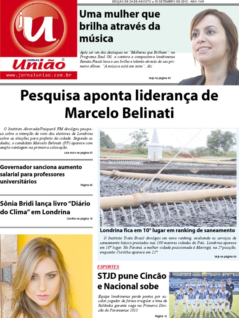 0067/2012. Na pesquisa estimulada, quando os nomes dos candidatos so apresentados ao entrevistado, Marcelo Belinati aparece com 39,4%. Em segundo aparece Barbosa Neto (PDT), com 12,2%. Mrcia Lopes (PT) vem em seguida, com 10%. O candidato Luiz Eduardo Cheida (PMDB) ficou em quarto, com 9,2%, seguido de Alexandre Kireeff (PSD), com 3,5% e Valmor Venturini (PSOL), com 0,6%.O nmero de indecisos chegou a 16,8%. Votos em branco chegam a 1,3%, enquanto 5,2% disseram que anularo o voto. Outros 1,8% disseram que no iro votar. Espontnea aponta vitria no primeiro turno J na pesquisa espontnea, sem apresentar o nome dos candidatos, Marcelo Belinati alcana 52,6% dos votos vlidos, o que garantiria uma vitria no primeiro turno. Barbosa Neto aparece novamente em segundo, com 16,3%, seguido de Mrcia Lopes, com 13,3%. Luiz Eduardo Cheida teve 12,3%, Alexandre Kireeff aparece com 4,7% , e Valmor Ven-