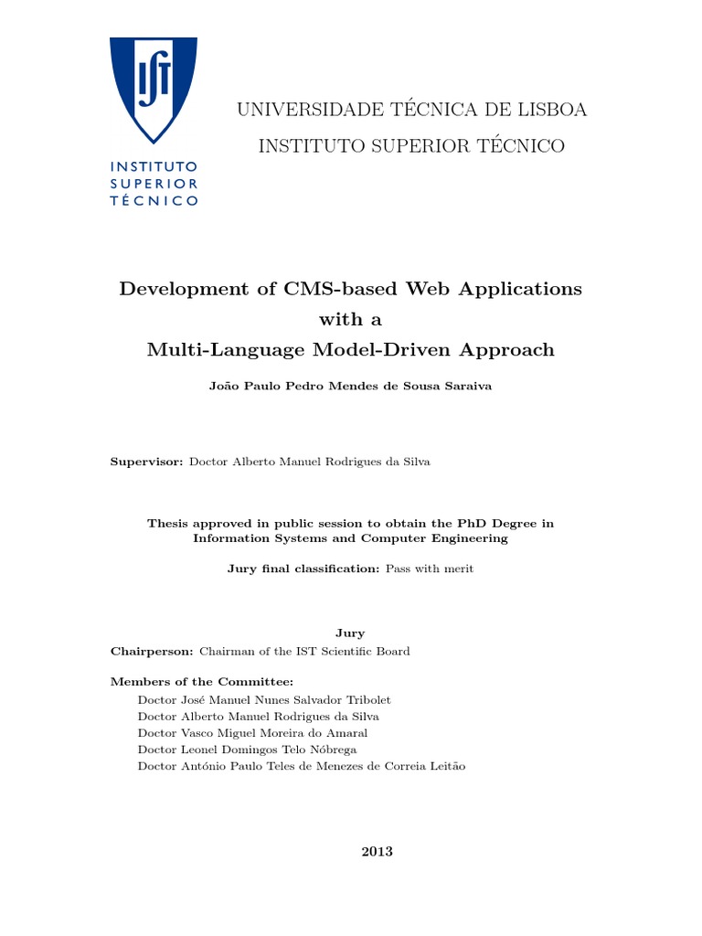 Jury Chairperson: Chairman of the IST Scientic Board Members of the Committee: Doctor Jos e Manuel Nunes Salvador Tribolet, Professor Catedr atico do Instituto Superior T ecnico, da Universidade T ecnica de Lisboa Doctor Alberto Manuel Rodrigues da Silva, Professor Associado do Instituto Superior T ecnico, da Universidade T ecnica de Lisboa Doctor Vasco Miguel Moreira do Amaral, Professor Auxiliar da Faculdade de Ci encias e Tecnologia, da Universidade Nova de Lisboa Doctor Leonel Domingos Telo N obrega, Professor Auxiliar do Centro de Ci encias Matem aticas, da Universidade da Madeira Doctor Ant onio Paulo Teles de Menezes de Correia Leit ao, Professor Auxiliar do Instituto Superior T ecnico, da Universidade T ecnica de Lisboa Funding Institutions Funda c ao para a Ci encia e Tecnologia (FCT)