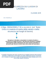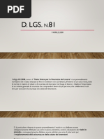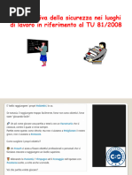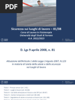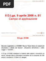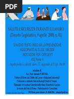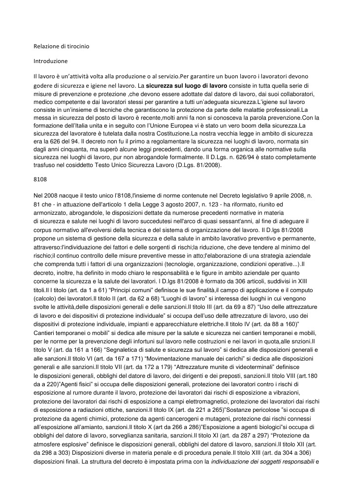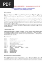 Nel 2008 nacque il testo unico l8108,l'insieme di norme contenute nel Decreto legislativo 9 aprile 2008, n. 81 che - in attuazione dell'articolo 1 della Legge 3 agosto 2007, n. 123 - ha riformato, riunito ed armonizzato, abrogandole, le disposizioni dettate da numerose precedenti normative in materia di sicurezza e salute nei luoghi di lavoro succedutesi nell'arco di quasi sessant'anni, al fine di adeguare il corpus normativo all'evolversi della tecnica e del sistema di organizzazione del lavoro. Il D.lgs 81/2008 propone un sistema di gestione della sicurezza e della salute in ambito lavorativo preventivo e permanente, attraverso:l'individuazione dei fattori e delle sorgenti di rischi;la riduzione, che deve tendere al minimo del rischio;il continuo controllo delle misure preventive messe in atto;l'elaborazione di una strategia aziendale che comprenda tutti i fattori di una organizzazioni (tecnologie, organizzazione, condizioni operative...).Il decreto, inoltre, ha definito in modo chiaro le responsabilit e le figure in ambito aziendale per quanto concerne la sicurezza e la salute dei lavoratori. l D.lgs 81/2008 formato da 306 articoli, suddivisi in XIII titoli.Il I titolo (art. da 1 a 61) Principi comuni definisce le sue finalit,il campo di applicazione e il computo (calcolo) dei lavoratori.Il titolo II (art. da 62 a 68) Luoghi di lavoro si interessa dei luoghi in cui vengono svolte le attivit,delle disposizioni generali e delle sanzioni.Il titolo III (art. da 69 a 87) Uso delle attrezzature di lavoro e dei dispositivi di protezione individuale si occupa delluso delle attrezzature di lavoro, uso dei dispositivi di protezione individuale, impianti e apparecchiature elettriche.Il titolo IV (art. da 88 a 160) Cantieri temporanei o mobili si dedica alle misure per la salute e sicurezza nei cantieri temporanei e mobili, per le norme per la prevenzione degli infortuni sul lavoro nelle costruzioni e nei lavori in quota,alle snzioni.Il titolo V (art. da 161 a 166) Segnaletica di salute e sicurezza sul lavoro si dedica alle disposizioni generali e alle sanzioni.Il titolo VI (art. da 167 a 171) Movimentazione manuale dei carichi si dedica alle disposizioni generali e alle sanzioni.Il titolo VII (art. da 172 a 179) Attrezzature munite di videoterminali definisce le disposizioni generali, obblighi del datore di lavoro, dei dirigenti e dei preposti, sanzioni.Il titolo VIII (art.180 da a 220)Agenti fisici si occupa delle disposizioni generali, protezione dei lavoratori contro i rischi di esposizione al rumore durante il lavoro, protezione dei lavoratori dai rischi di esposizione a vibrazioni, protezione dei lavoratori dai rischi di esposizione a campi elettromagnetici, protezione dei lavoratori dai rischi di esposizione a radiazioni ottiche, sanzioni.Il titolo IX (art. da 221 a 265)Sostanze pericolose si occupa di protezione da agenti chimici, protezione da agenti cancerogeni e mutageni, protezione dai rischi connessi allesposizione allamianto, sanzioni.Il titolo X (art da 266 a 286)Esposizione a agenti biologicisi occupa di obblighi del datore di lavoro, sorveglianza sanitaria, sanzioni.Il titolo XI (art. da 287 a 297) Protezione da atmosfere esplosive definisce le disposizioni generali, obblighi del datore di lavoro, sanzioni.Il titolo XII (art. da 298 a 303) Disposizioni diverse in materia penale e di procedura penale.Il titolo XIII (art. da 304 a 306) disposizioni finali. La struttura del decreto impostata prima con la individuazione dei soggetti responsabili e