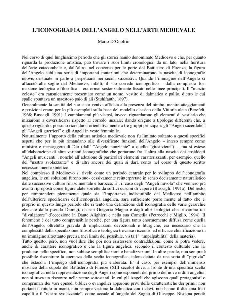 Nel corso di quel lunghissimo periodo che gli storici hanno denominato Medioevo e che, per quanto riguarda la produzione artistica, pu trovare i suoi limiti cronologici, da un lato, nella fioritura dellarte catacombale e, dallaltro, nel concorso per le porte del Battistero di Firenze, la figura dellAngelo sub una serie di importanti mutazioni che determinarono la nascita di iconografie nuove, destinate in parte a perpetuarsi nei secoli successivi. Quando limmagine dellAngelo si affacci alle soglie del Medioevo, infatti, il suo corredo iconografico dalla complessa formazione teologica e filosofica era ormai sostanzialmente fissato nelle linee principali. Il nunzio celeste era canonicamente presentato come un uomo, vestito di dalmatica e pallio, dietro le cui spalle spuntava un maestoso paio di ali (Stuhlfauth, 1897). Generalmente la santit del suo stato veniva affidata alla presenza del nimbo, mentre atteggiamenti e posizioni erano per lo pi esemplati sulla base del modello classico della Vittoria alata (Berefelt, 1968; Bussagli, 1991). I cambiamenti pi vistosi, invece, riguardarono gli elementi di vestiario che iniziarono a diversificarsi rispetto al corredo iniziale, dando origine a tipologie differenti che, a questo riguardo, possono ricondursi orientativamente a tre gruppi principali: gli Angeli sacerdote; gli Angeli guerrieri e gli Angeli in veste femminile. Naturalmente 1apporto della cultura artistica medievale non fu limitato soltanto a questi specifici aspetti che per lo pi rimandano alle diversificate funzioni dellAngelo inteso sempre come ministro e messaggero di Dio (dall Angelo nunziante a quello giustiziere) ma si estese allelaborazione di altre varianti iconografiche che portarono fra 1altro alla nascita dei cosiddetti Angeli musicanti, nonch alladozione di particolari elementi caratterizzanti, per esempio, quello del nastro svolazzante e di altri ancora dei quali si dar conto nel corso di questo scritto necessariamente sintetico. Nel complesso il Medioevo si rivel come un periodo centrale per lo sviluppo delliconografia angelica, le cui soluzioni furono suc- cessivamente reinterpretate in senso decisamente naturalistico dalle successive culture rinascimentale e barocca. E, il caso degli Angeli nuvola che vennero pi avanti riproposti come figure alate sorrette da soffici cuscini di vapore (Bussagli, 1991a). Del resto, per comprendere pienamente quale sia limportanza indiscutibile del Medioevo nellambito dellulteriore specificarsi delliconografia angelica, sar sufficiente porre mente al fatto che proprio in questo lungo periodo che si tent una definizione delliconografia delle varie gerarchie elencate dallo pseudo Dionigi, da san Gregorio Magno e dagli altri teologici che trovarono un divulgatore deccezione in Dante Alighieri e nella sua Comedia (Petrocchi e Miglio, 1994). Il fenomeno del tutto comprensibile perch, per una figura tanto enormemente diffusa come quella dellAngelo, oltretutto gravida di implicazioni devozionali e liturgiche, era necessario che la complessit della speculazione filosofica e teologica trovasse riscontro ed efficace chiarificazione in unimmagine altrettanto precisa (nei limiti del possibile, vis ta 1 impalpabilit della materia). Tutto questo, per, non vuol dire che poi non esistessero contraddizioni, come si potr vedere, anche di carattere iconografico e che la figura angelica, secondo il contesto culturale che la produsse nello specifico, non subisse semplificazioni e banalizzazioni. In altre parole, non sempre possibile riscontrare la coerenza della scelta iconografica, talora dettata da una sorta di pigrizia che ostacola 1impiego delliconografia pi elaborata. E il caso, per esempio, dellimmenso mosaico della cupola del Battistero di Firenze (XIII secolo) dove, a fronte di una specifica scelta iconografica nella rappresentazione degli Angeli come esponenti del primo dei nove ordini angelici, non si trova un riscontro nelle scene sottostanti, in cui gli Angeli che agiscono quali protagonisti o comprimari dei vari episodi biblici o evangelici appaiono privi delle caratteristiche dei primi: non portano il rotulo in mano, non sempre vestono la dalmatica con i clavi, non hanno il diadema fra i capelli o il nastro svolazzante, come accade allangelo del Sogno di Giuseppe. Bisogna perci