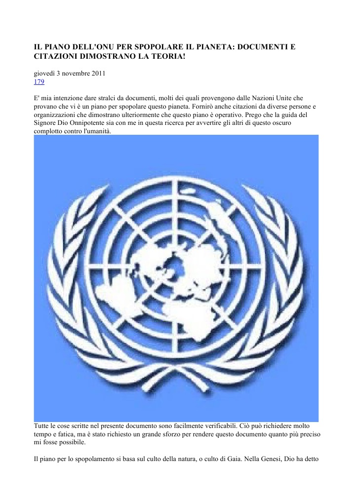 gioved 3 novembre 2011 179 E' mia intenzione dare stralci da documenti, molti dei quali provengono dalle Nazioni Unite che provano che vi un piano per spopolare questo pianeta. Fornir anche citazioni da diverse persone e organizzazioni che dimostrano ulteriormente che questo piano operativo. Prego che la guida del Signore Dio Onnipotente sia con me in questa ricerca per avvertire gli altri di questo oscuro complotto contro l'umanit.