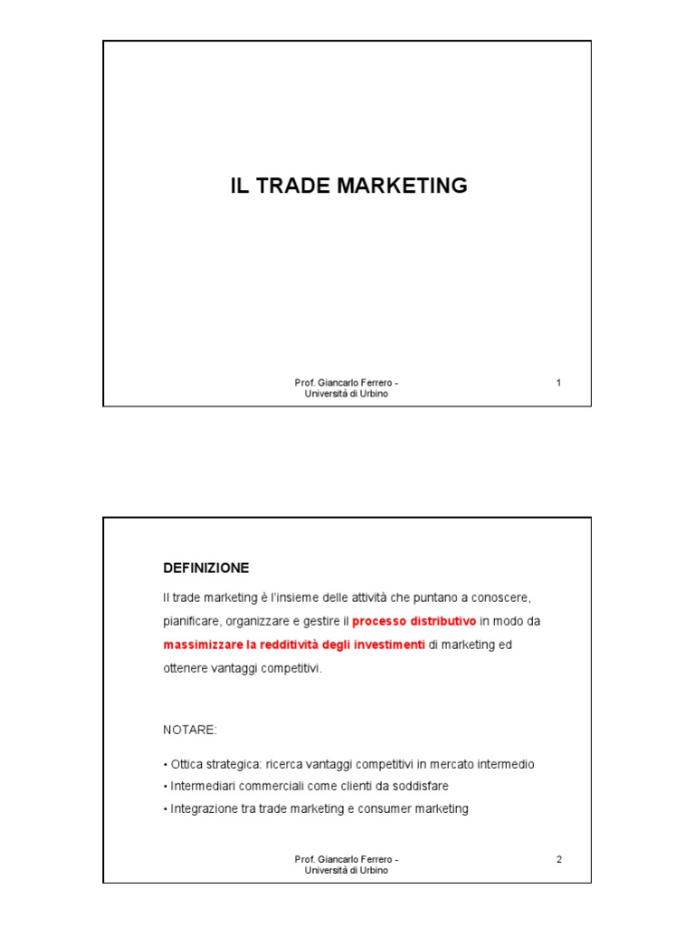 Il trade marketing linsieme delle attivit che puntano a conoscere, pianificare, organizzare e gestire il processo distributivo in modo da massimizzare la redditivit degli investimenti di marketing ed ottenere vantaggi competitivi.