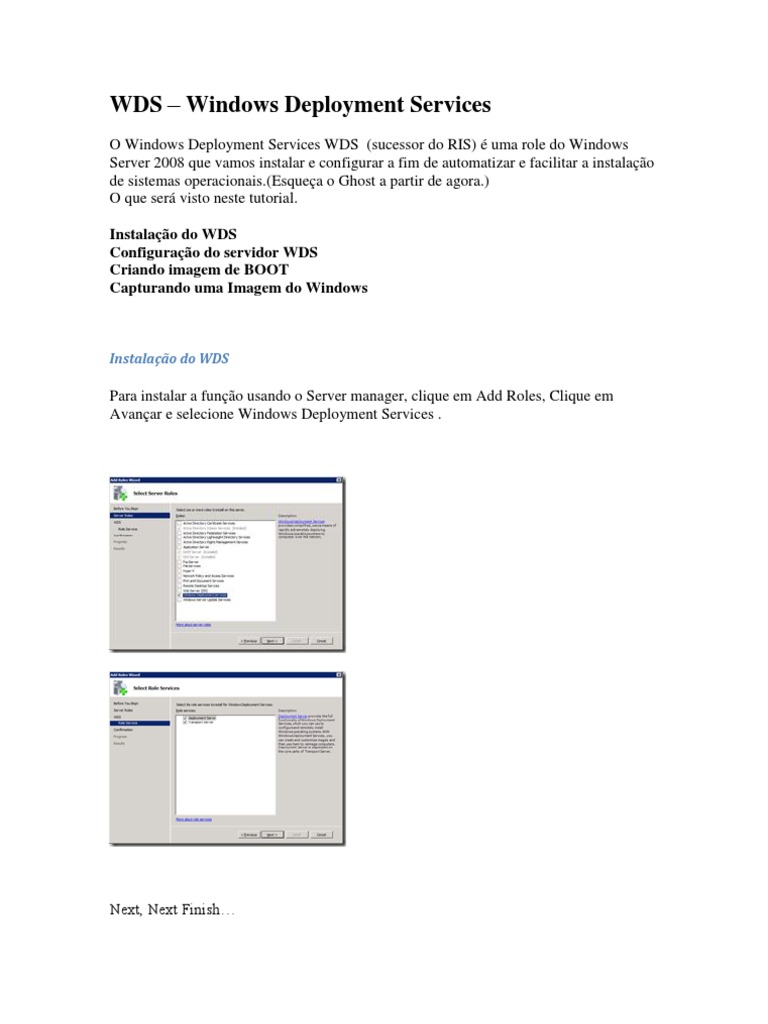O Windows Deployment Services WDS (sucessor do RIS) uma role do Windows Server 2008 que vamos instalar e configurar a fim de automatizar e facilitar a instalao de sistemas operacionais.(Esquea o Ghost a partir de agora.) O que ser visto neste tutorial. Instalao do WDS Configurao do servidor WDS Criando imagem de BOOT Capturando uma Imagem do Windows