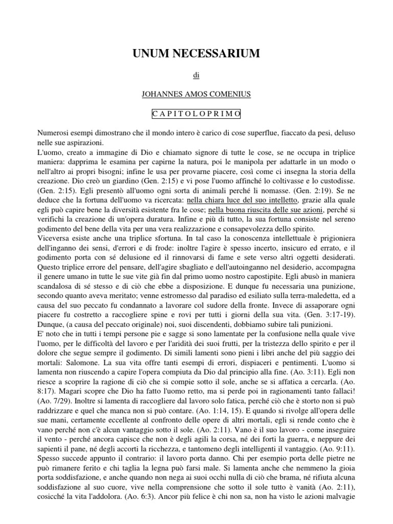 l conduce la via verso i tesori eterni e la magnificenza eterna, se avrete il senso di Cristo e se persisterete fino alla fine. Voi Signore che una volta dicevate a Pietro:"Quando sarai convertito, allora rafforza i tuoi fratelli", ora parlate a me, Vostro servo:"Poich vi siete convertito dal non necessario all'unico necessario, allora insegnate questo anche ai vostri fratelli." Io chiamo fratelli tutti coloro che invocano il nome di Cristo, chiamo fratelli tutti coloro che sono di un unico sangue, tutta la discendenza di Adamo, abitante su tutta la superficie terrestre. La stessa saggezza di Cristo, l'unico necessario, raccomando anche a te, o mio popolo della Moravia, ed ai vicini Cechi, Selesiani, Polacchi ed Ungheresi che furono ospitali nell'accogliermi al tempo del mio esilio e dai quali ricevetti molti benefici, come riconferma dell'unico necessario. Che il Signore vi dia la saggezza e possiate godere i vantaggi dei vostri paesi benedetti a di non farne cattivo uso. "L'eccesso ha gettato la Boemia nella rovina" disse un re saggio* del nord, un sovrano che era nemico dell'eccesso. Ma lo stesso si dovr dire presto pure di te o Polonia, se non ritorni in tempo all'unico necessario, la semplicit. Perch l'inizio dell'ingiustizia di Sodoma era la superbia, l'ingordigia e gli ozi indolenti. (Ezech. 16:49). Infine la capitale dei Paesi Bassi, il luogo mercantile del mondo, mi offr ospitalit per dodici anni. Qui ho avuto occasione, meglio che in qualsiasi altro posto, di notare di quanto si pu fare a meno. Qui mi sono sorti quei pensieri sull'unico necessario. Ardentemente speravo la liberazione dalle migliaia di labirinti che mi circondavano, e fra le migliaia di pietre, che innumerevoli uomini giornalmente rotolano, di non portare pi avanti le pietre delle mie proprie difficolt, ma di riunirle in un quadrato e di fissarle. L appresi pure in mezzo alle folle degli affamati e assetati "Tantalus" che non si saziano mai, di non soffrire pi n di fame n di sete, grazie alla misericordia di Dio. Questo sar durante i prossimi giorni della mia vita, il mio tesoro pi grande e mia suprema gioia. Mi ricordo come al mio arrivo fui ricevuto inizialmente dai primi cittadini con tutti gli onori. Si sperava che la mia presenza potesse significare un particolare progresso nello sviluppo. Spero tuttavia di poter agire secondo l'esempio del Signore che aveva conservato alle nozze di Cana il vino migliore per ultimo, cosicch il mio ultimo dono sar migliore di quanto ci si aspettava da me inizialmente. Spero, quando accadr, che vi saranno dispensieri esperti per pronunziare una sentenza giusta sull'acqua trasmutata in vino. Quale sentenza? La sentenza apostolica! Certo la piet un grande guadagno, congiunta per a moderazione. Infatti, non abbiamo portato nulla in questo mondo e nulla possiamo portarne via. Dunque, quando abbiamo di che mangiare e di che coprirci, accontentiamoci. Al contrario, coloro che vogliono arricchire, cadono nella tentazione, nel laccio ed in molte bramosie insensate e funeste, che fanno andare gli uomini alla rovina e alla perdizione. (al Ti. 6:62). Perci la cosa analoga a quanto la scrittura dice di Babilonia, sia con l'indicazione del nome mistico di quel posto, i cui abitanti sono sparpagliati nel mondo, sia dellantica citt che si trovava in Caldea, che si era abbandonata ad eccessi e ingordigia e che si occupava solamente di raccogliere tesori dal mondo intero, di acquistarli e venderli. (Riv. 18:11-20). Poich ogni societ umana, ogni stato, ed ogni paese aspira con un amore, che diventa ardente passione agli interessi terrestri, si dimentica molto facilmente i beni migliori che sono dal cielo e che sono eterni, si dimentica Dio, la fonte di ogni bene e cade in rovina e declino. "Vino bevuto moderatamente, rafforza la vita degli uomini" dice il saggio Jesus Sirach, ma bevuto in eccesso veleno e morte, e nel vino sono affogati gi pi uomini che nell'acqua. Signore Ges Cristo, tu unico maestro della saggezza, che ci hai dato per sempre la regola dell'unico necessario, ti chiedo due cose, non me le negare, prima che muoia. Non lasciare lontano da me ci di cui ho bisogno per vivere pio e per morire beato. E tieni lontano da me tutto ci che non utile e che non necessario a questo fine. Ma questo ti prego, fa che anche agli altri venga mostrato quanto agiscono follemente, quando si lasciano andare interiormente a faccende inutili e non si preoccupano di ci che invero necessario. Mentre tu inviti tutti ad aspirare all'acqua viva, essi si scavano cisterne, cisterne screpolate che non